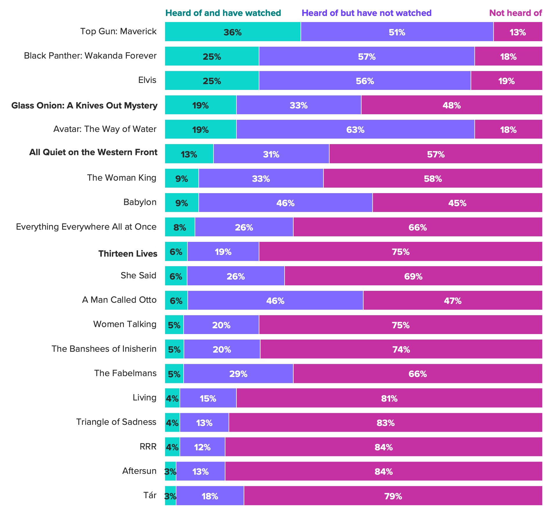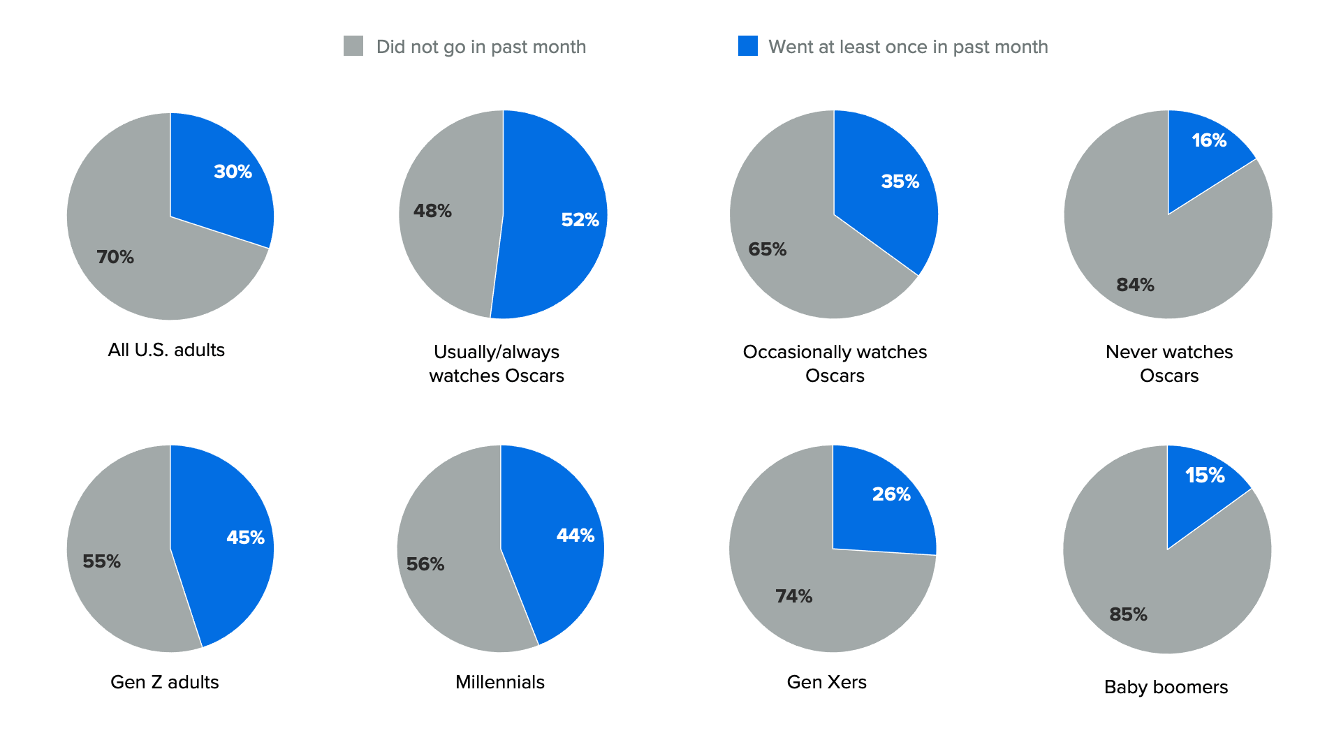 Meanwhile, the share of frequent Oscars viewers who went to the movies in the past month (52%) also eclipsed the shares of all adults (30%) and of every age cohort, especially Gen Xers (26%) and baby boomers (15%), the latter of whom have been particularly reluctant to frequent theaters since the pandemic began. And as video streamers like Apple and Amazon experiment more with theatrical releases, retaining relevance with any audience inclined to frequent cinemas is paramount.