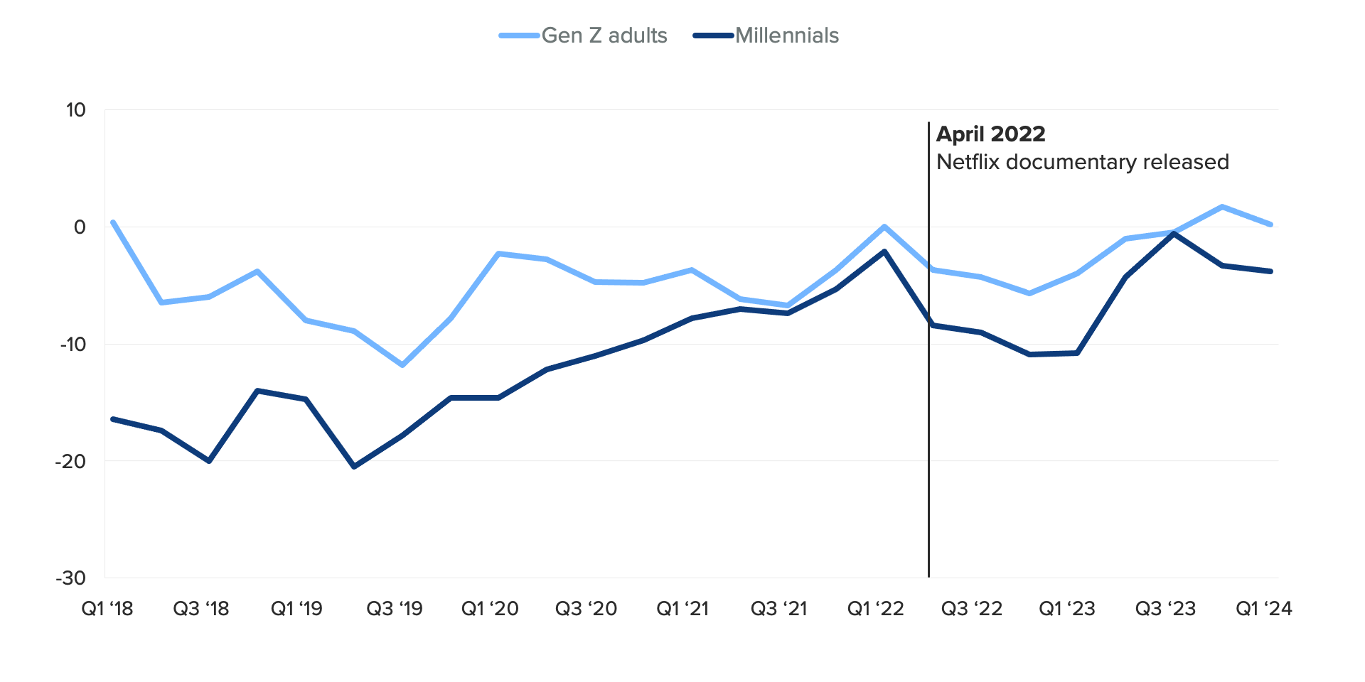 There was a notable dip in favorability in early 2022. That spring Netflix released the documentary White Hot: The Rise & Fall of Abercrombie & Fitch, covering the brand’s many controversies when it was helmed by former CEO Mike Jeffries, now under FBI inquiry for sex crimes. Shoppers noticed: the brand’s favorability dropped 6.9 points among Gen Zers that quarter. Two years later, all seems forgiven as favorability has gained the ground lost in 2022 among Gen Z and millennials.