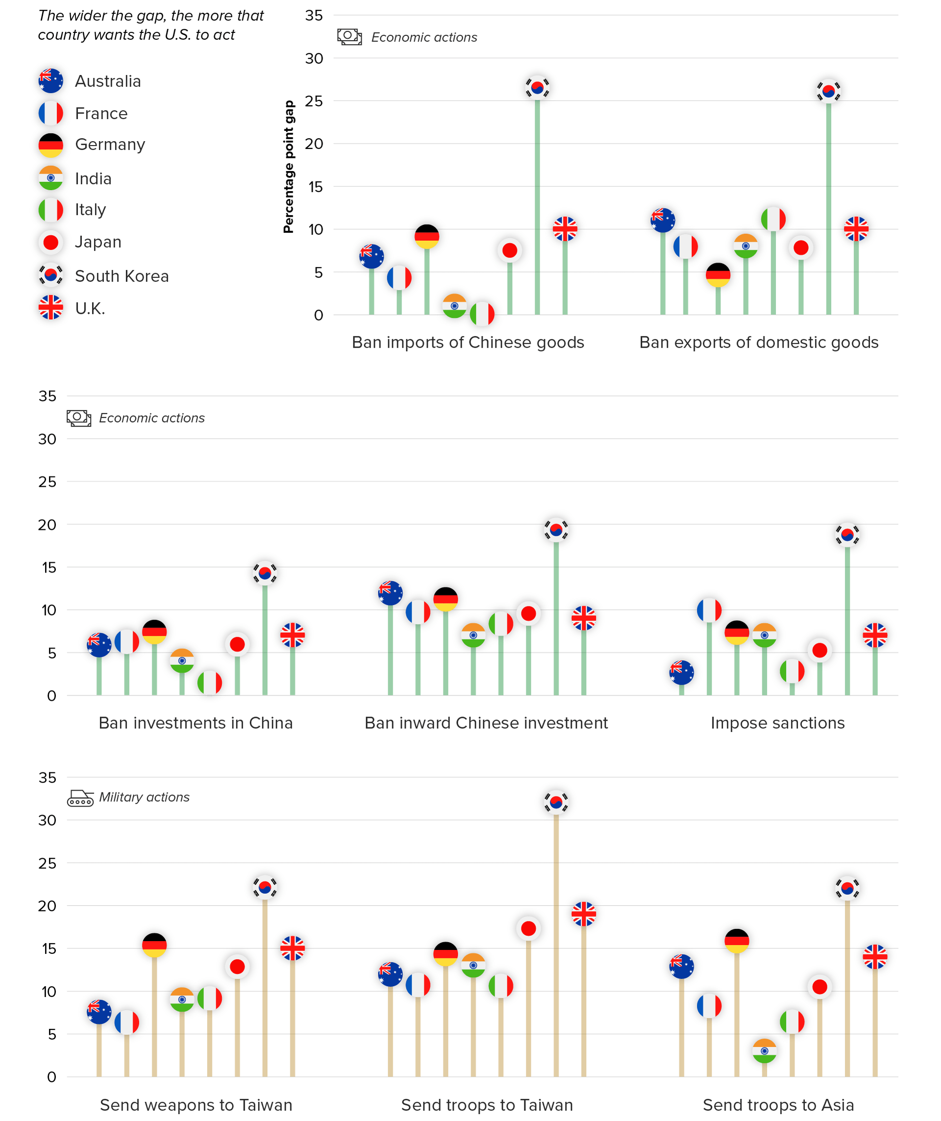 The United Kingdom and South Korea — both major U.S. allies and trading partners — show the greatest risk of wavering. Across all policy options, the gaps between the shares of adults who would prefer that the United States move against China relative to their own government doing so are larger in the United Kingdom and South Korea than in all other countries surveyed. When it comes to gaps in support for military retaliation specifically, Germany and Japan are close behind.