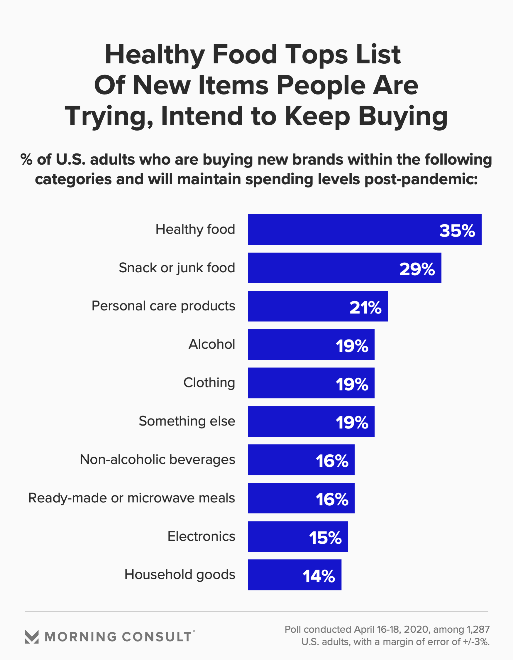 At least a few categories in which consumers have tried new products since the COVID-19 outbreak can be optimistic that some of those new customers won’t disappear. Thirty-five percent of Americans spending more on new healthy food items expect to continue buying new items they’ve tried in recent weeks and 29 percent said the same of snack foods, though it remains to be seen how habits adjust once a sense of normalcy returns, as consumers predict their absolute consumption levels of these near-opposite categories to look quite different as life transitions back to “normal.”