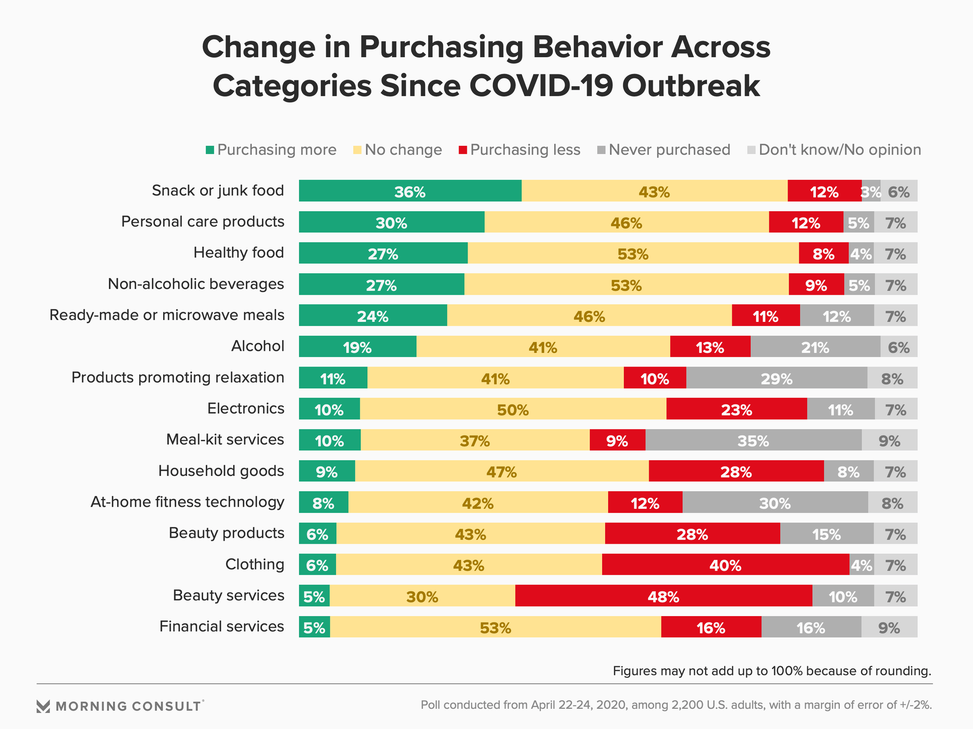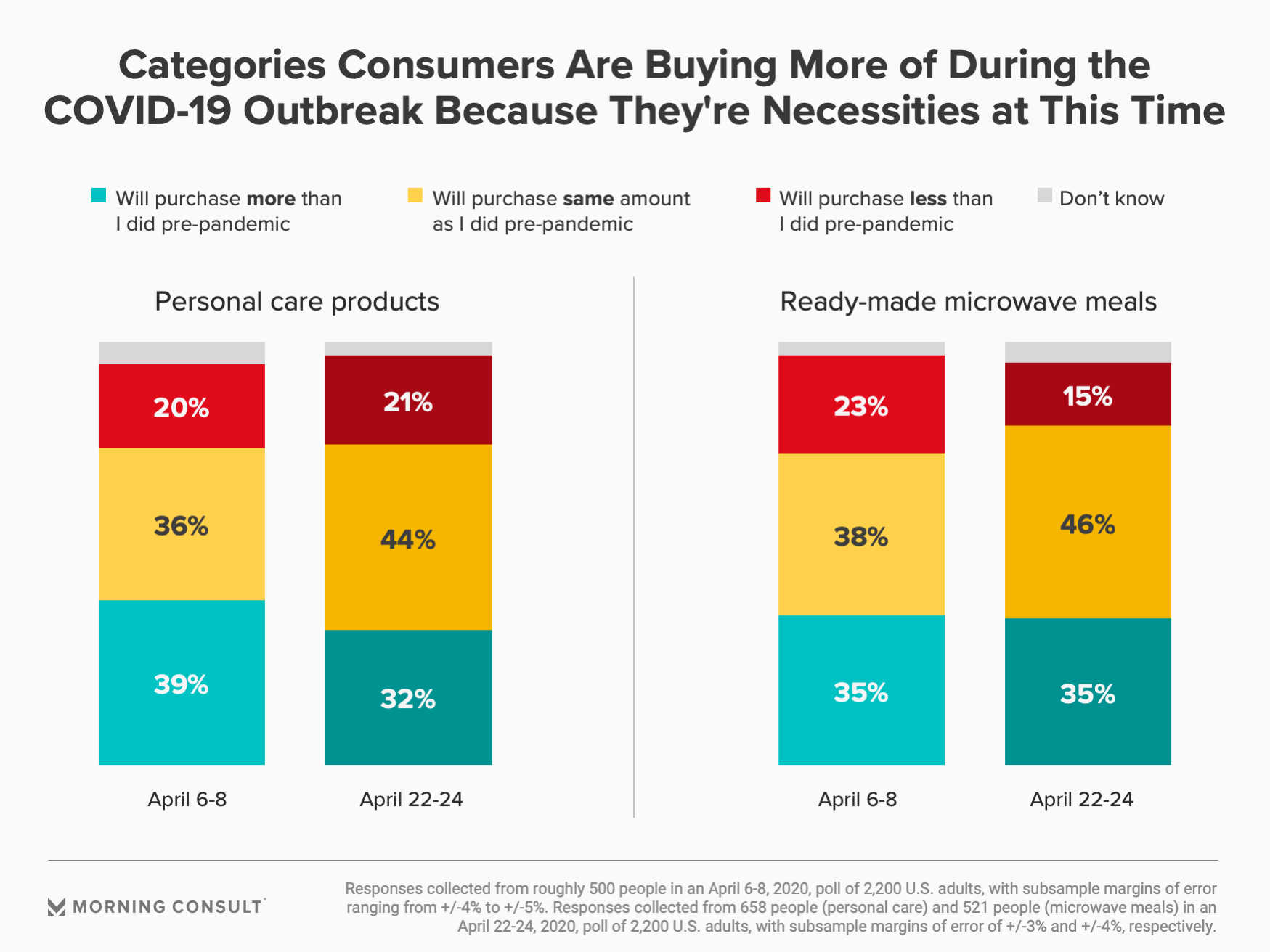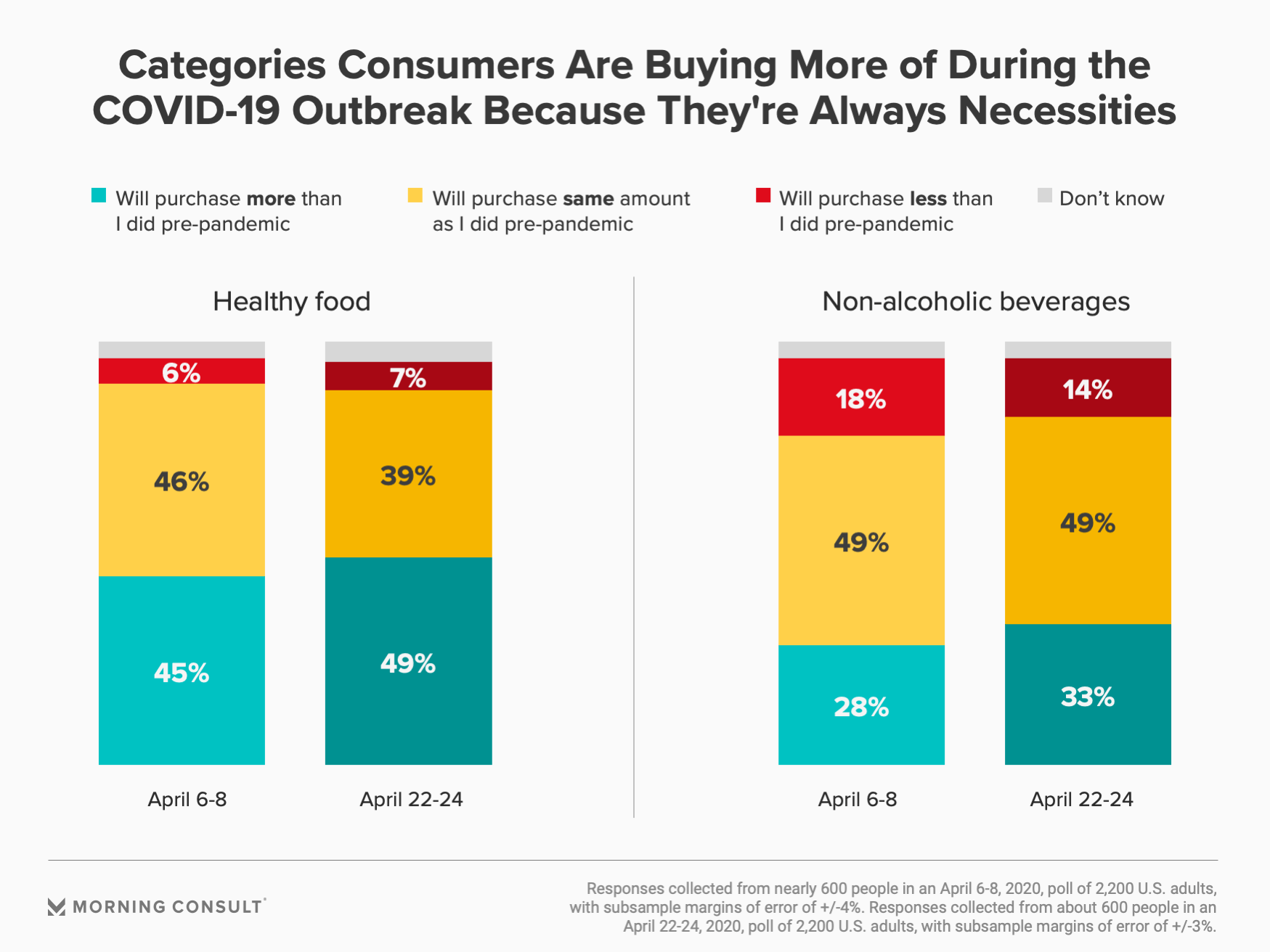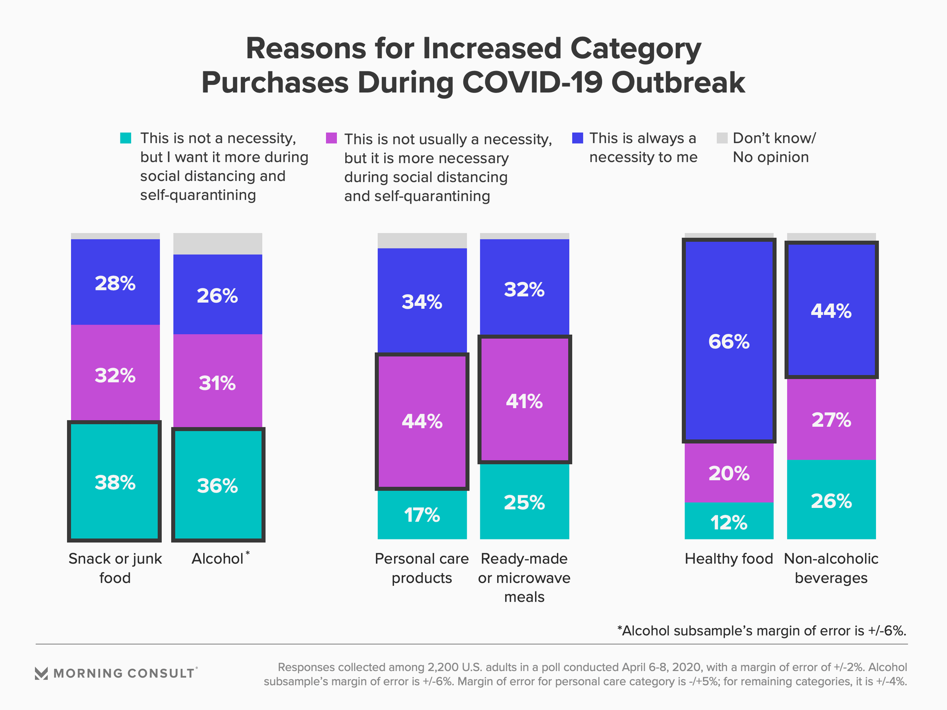 While non-alcoholic beverages and healthy food are being purchased more out of necessity, snack and junk food and alcohol aren’t a necessity to those buying more -- consumers are buying more of these since they simply desire these items more during social distancing and self-quarantining. Ready-made meals and personal care products aren’t considered necessities either, but they are being purchased more because, unsurprisingly, these items have become more necessary given the situation.