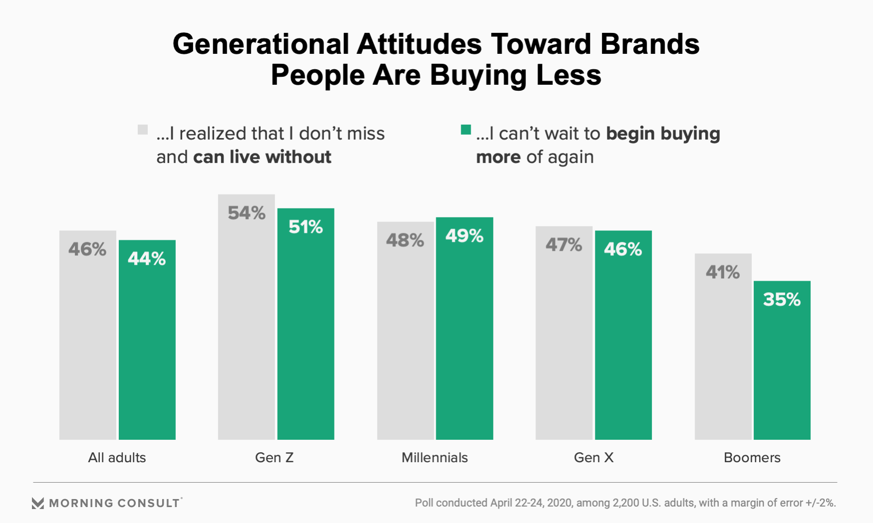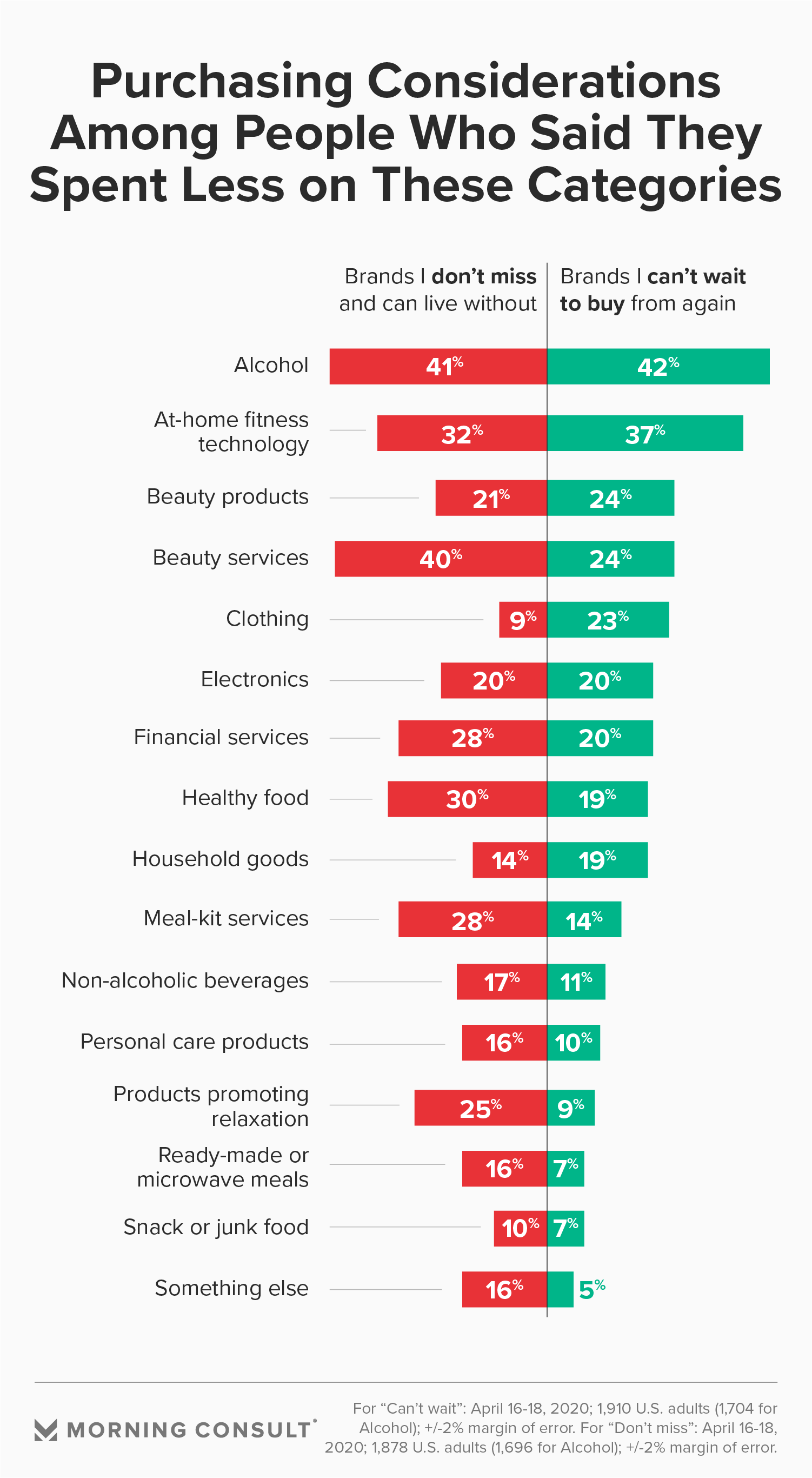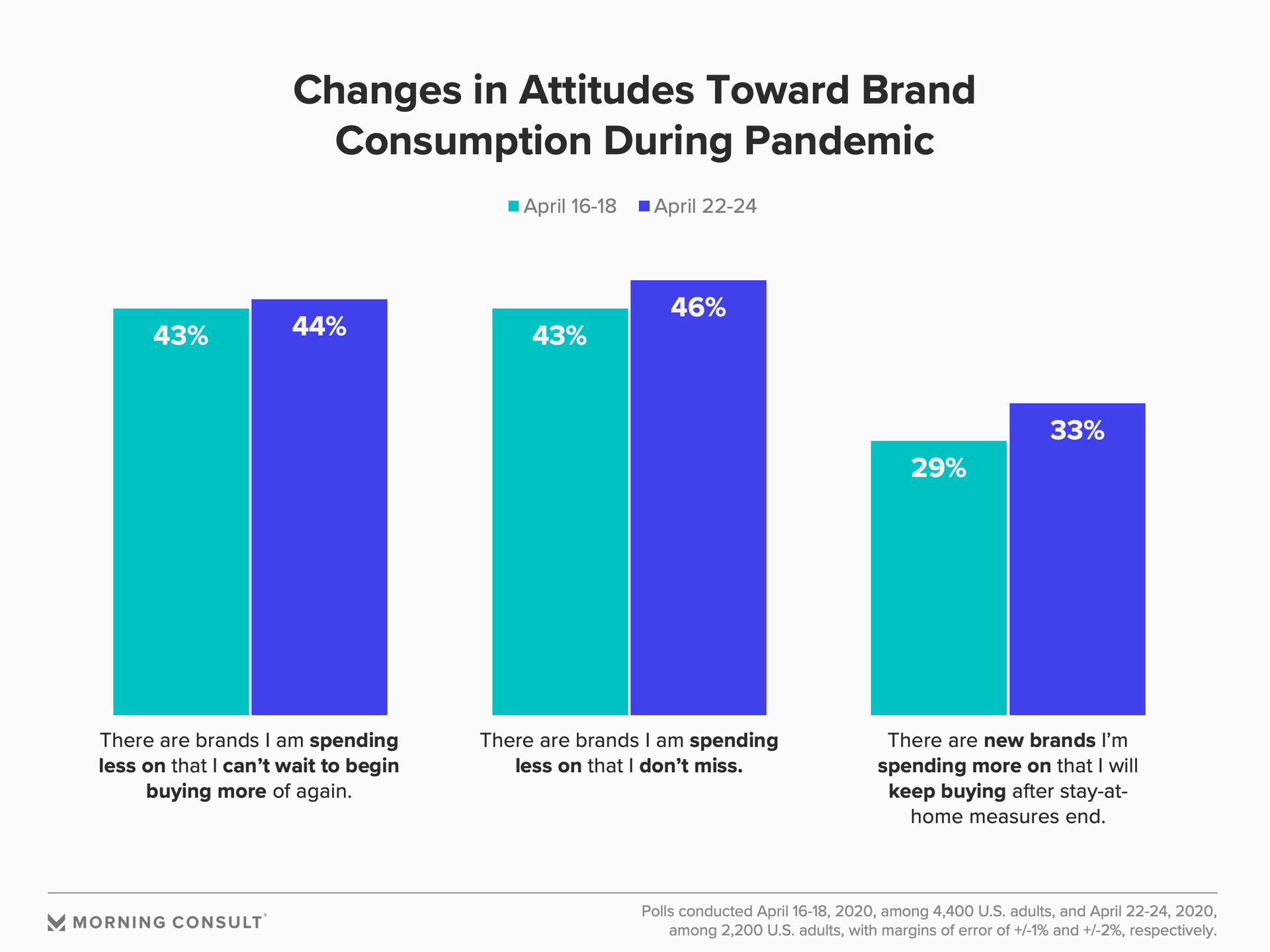 44% of American adults can’t wait to begin buying brands they’re currently spending less on again, but 46% have realized that they don't miss these items and would be fine living without them post-pandemic -- a sentiment that’s only strengthened in the last few weeks.