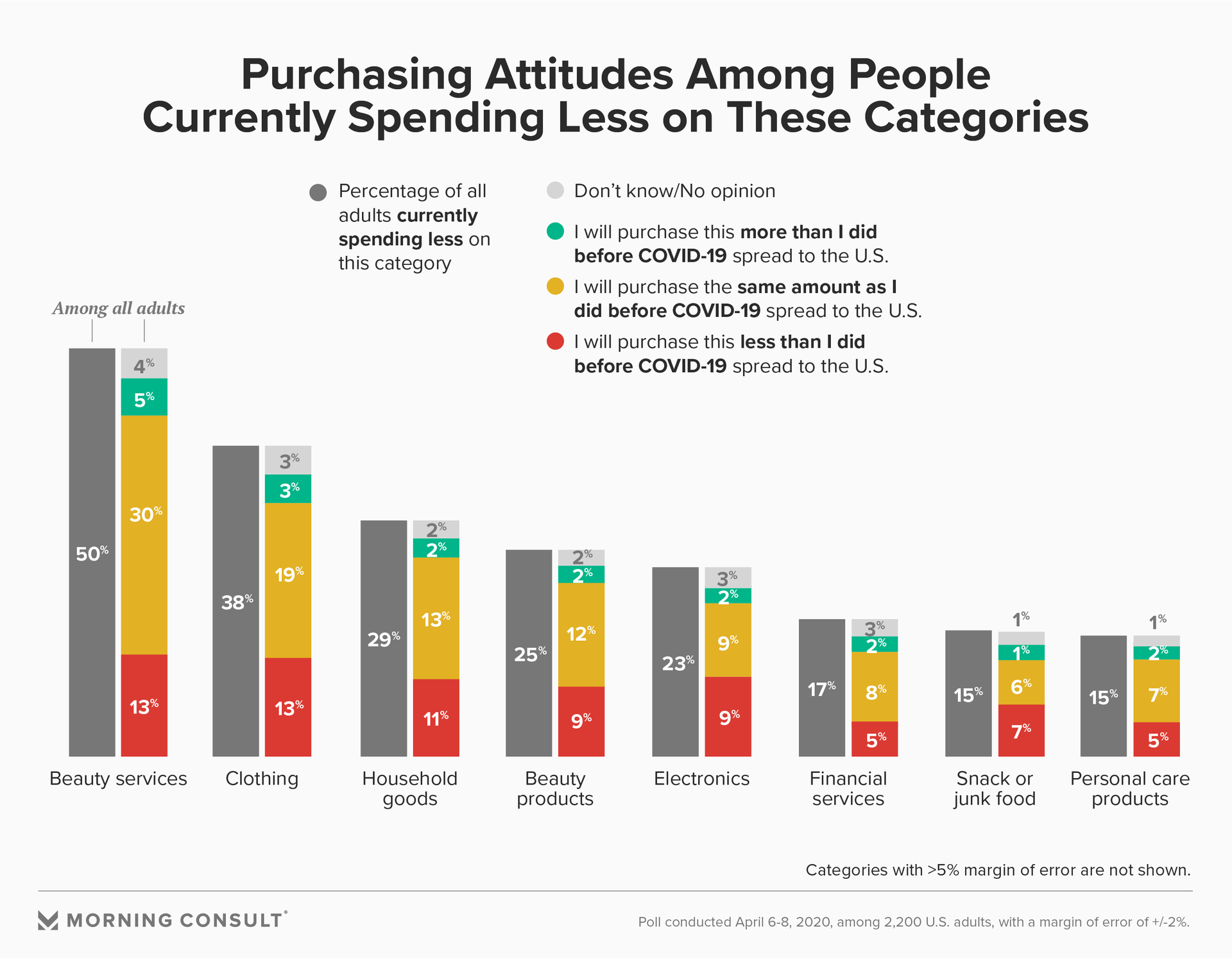 Unsurprisingly, spending on beauty services, clothing, beauty products, household goods and electronics is down since the coronavirus outbreak.