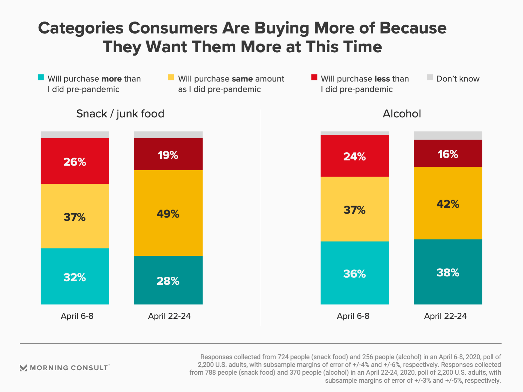 But consumers buying more snack and junk food and alcohol because they simply want them more at this time are mixed in their anticipated post-pandemic purchasing levels. While they are about as likely to purchase more alcohol as they are to revert to pre-pandemic consumption levels, they are quite likely to revert to pre-crisis levels of snack and junk food consumption.