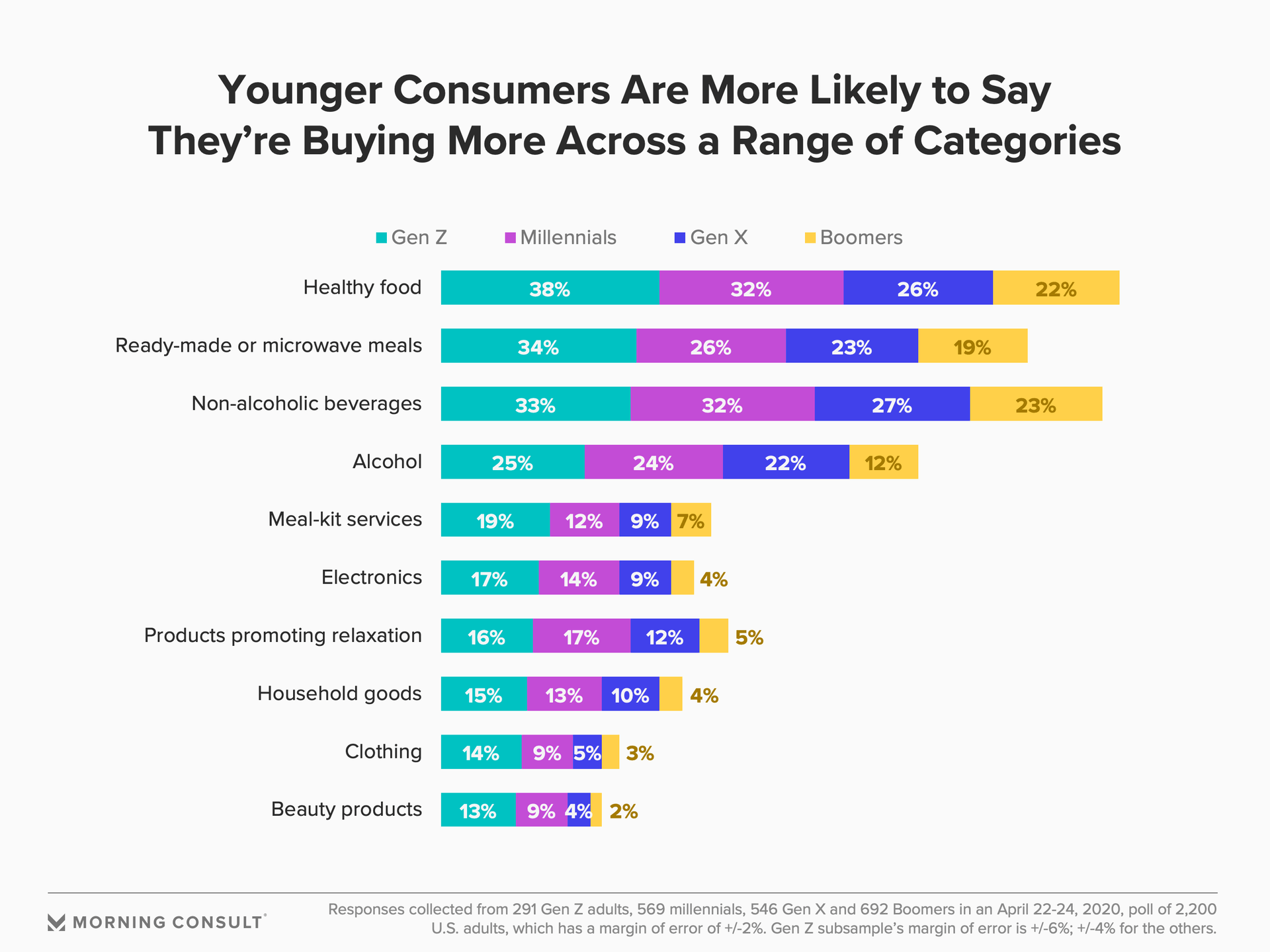 Finally, looking at genders, women are purchasing significantly more snack and junk food while men are buying more meal-kit services or electronics. Women are also cutting back notably on beauty services, clothing and beauty products much more significantly than men are, likely because they were the higher spenders on these categories in the first place, and because these are top categories impacted by stay-at-home measures and non-essential store closures. Still, companies in these three categories should act on this opportunity to maintain a close relationship with otherwise engaged customers as they turn their spending to less healthy comfort-food products. This will not only increase likelihood of repurchase post-pandemic, but also demonstrate the depth of a brand’s value by providing new, healthier, relationship-building ways to help women navigate this stressful situation.