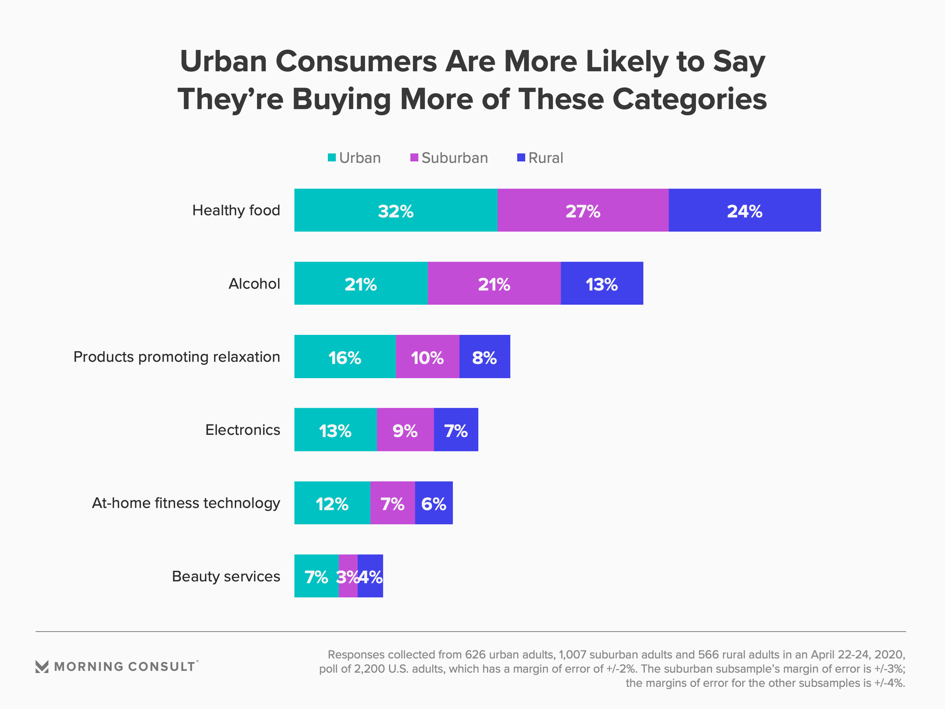 Urban populations are consuming notably more of most categories, including twice the increase in at-home fitness equipment, relaxation-related products and electronics relative to their suburban and rural peers. In combination with the alcohol urbanites are also purchasing notably more of during this time, it’s clear that the usual entertainment options and pastimes of city life have left this audience turning to certain categories to pass the time and provide comfort. Brands would be wise to find ways to fill these lifestyle gaps for urban consumers who are likely seeking the escape that more suburban life naturally affords.