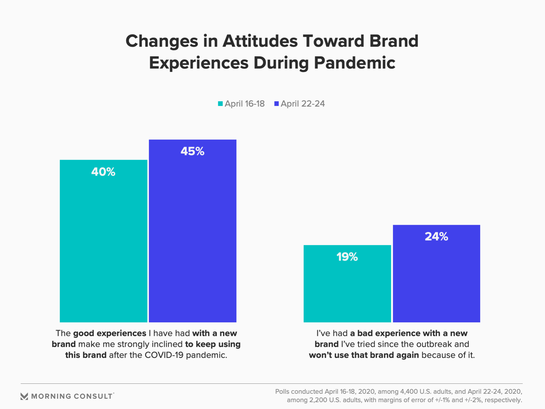 Consumers are paying close attention to the experiences companies are delivering to determine whether or not new brands and companies are worth sticking with post-pandemic. In just a week’s time, Morning Consult research finds that consumers are more strongly considering continued purchasing from brands that they’ve newly tried since the outbreak (33 percent, up 4 percentage points) -- and, importantly, from new brands delivering a good experience (45 percent, up 5 percentage points).