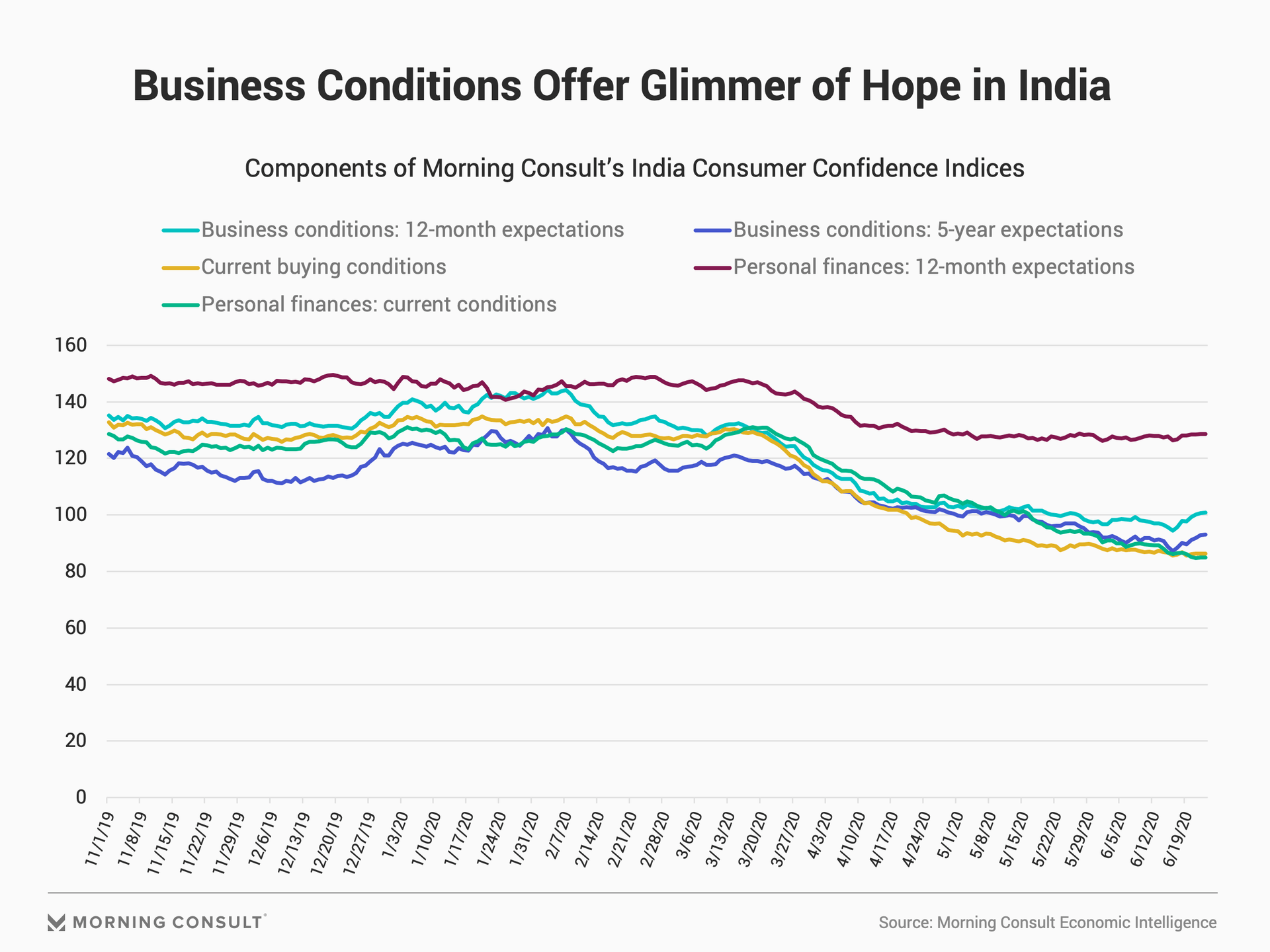 The consumer outlook in India is dire. Indian consumers have consistently grown more pessimistic about their personal finances and the economic conditions in the country as a whole since March 24, the day that Prime Minister Modi announced a nationwide lockdown for India’s 1.3 billion people. Unlike in China or Japan, consumer confidence in India continues to decrease. While both business conditions components surged after Modi’s June 17 announcement that he will move forward with the second phase of removing restrictions on social and economic activities, they remain below where they were 30 days prior.