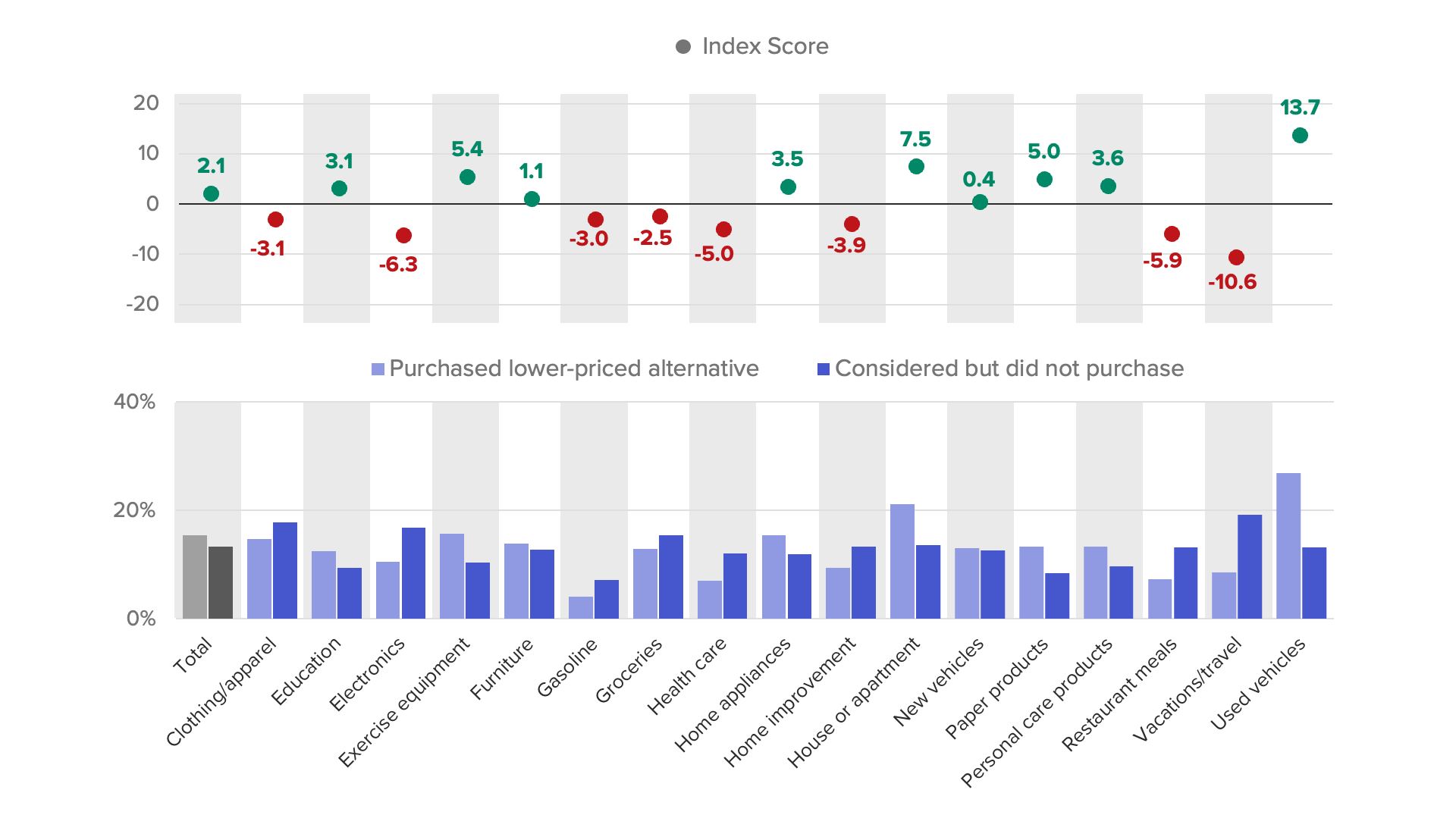 The Substitutability Index is measured in a similar way, comparing the share of potential purchases that were completed by choosing a lower-priced alternative (the tested purchasing behavior) to the share of potential purchases that were not completed (the control purchasing behavior). When the share of consumers who traded down exceeds those who did not make a purchase they were considering, the index is positive. Conversely, when the share who did not make a purchase exceeds those who traded down, the index is negative.
