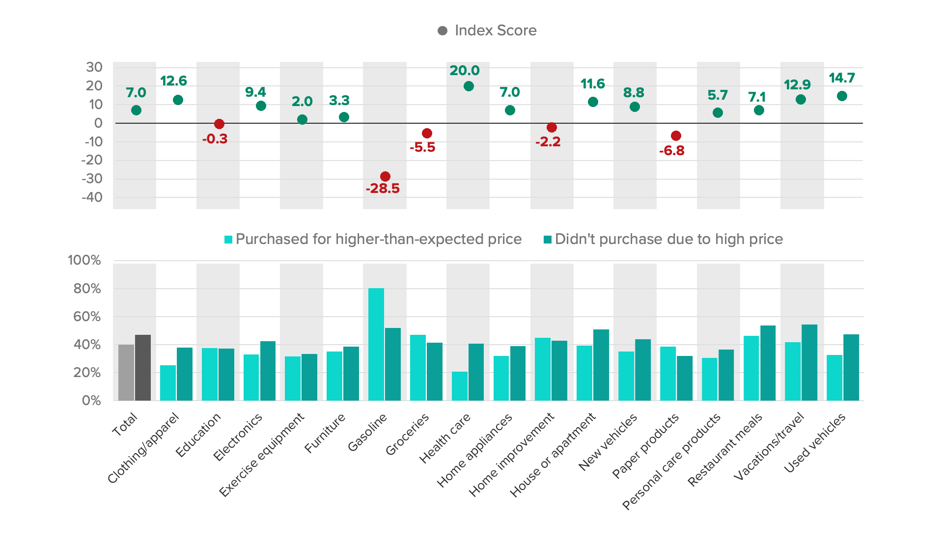 In June, both components of the Consumer Purchasing Power Barometer pointed to rising inflationary pressures on consumer spending. However, the degree to which product-level purchasing decisions were influenced by inflation varied depending on the nature of the product or service. For some items, including large durables with resale value (such as cars or homes) or discretionary purchases (like vacations), higher prices meant fewer or smaller purchases. In other cases, especially for everyday essentials like groceries, it wasn’t possible for consumers to opt out of purchases, regardless of price. Some goods and/or services were also difficult to trade down, either because they are highly differentiated (like travel) or commoditized (like gas).