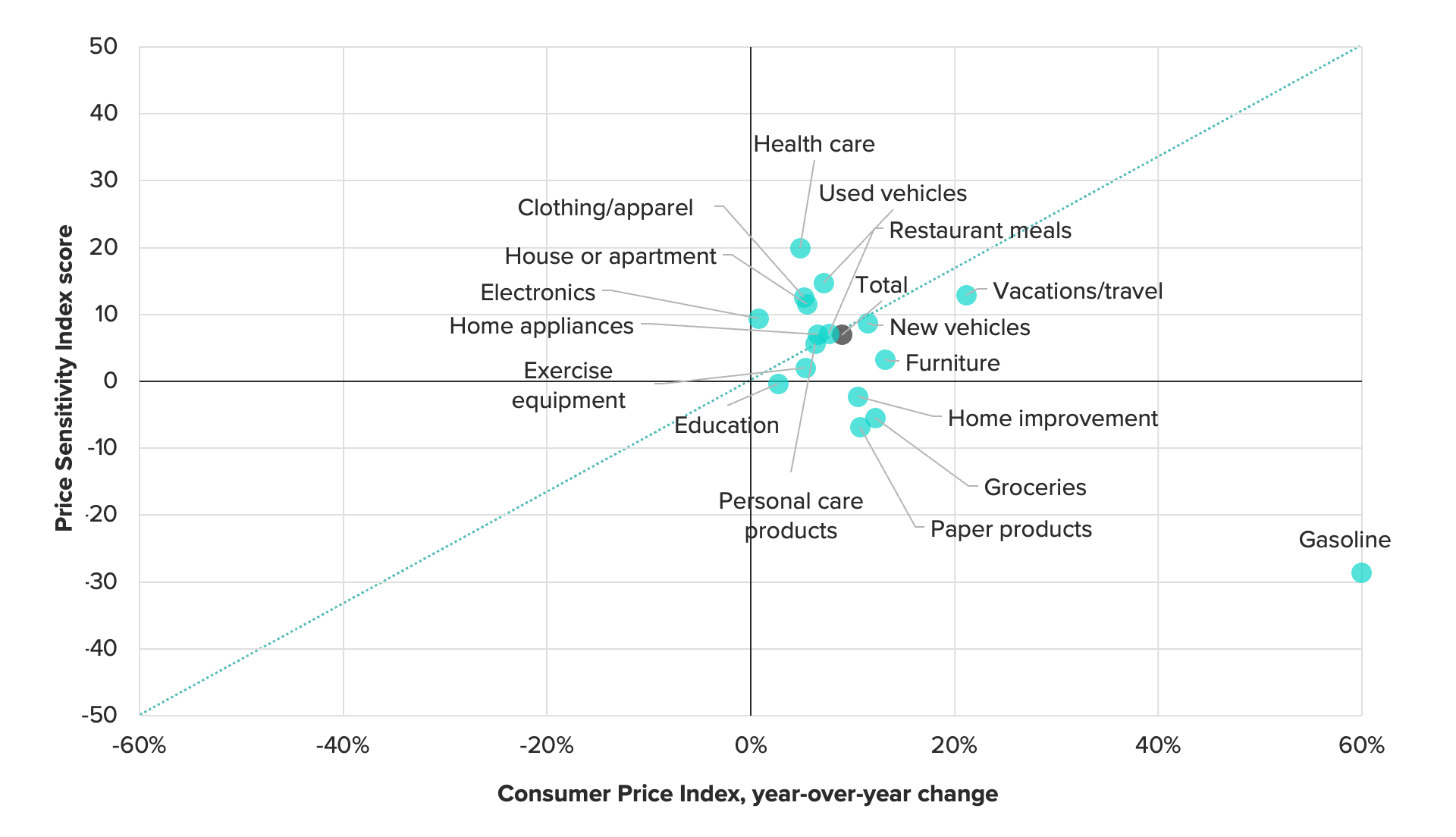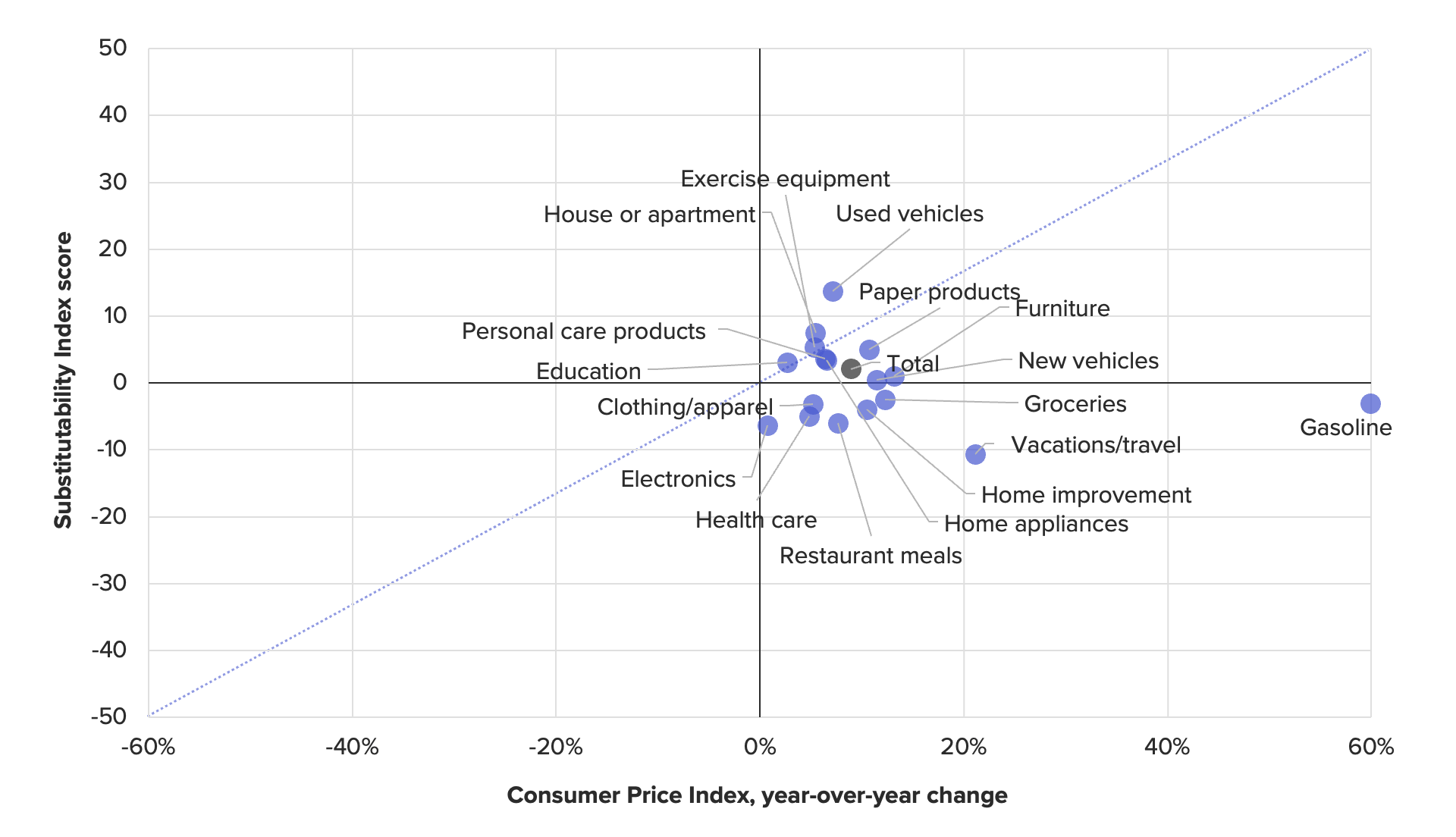 To further evaluate the relationship between consumer spending and inflation, we plotted the June category-level values for Price Sensitivity and Substitutability against the corresponding annual inflation for those goods and services. Most categories cluster around the 45-degree line in the chart for Price Sensitivity. This means that as inflation for a given category increased, the net share of consumers who walked away from a purchase because of price, compared with those who went ahead with the purchase anyway, increased by a nearly equal amount. In fact, for the total index value, the relationship is nearly one-for-one, falling almost on top of that 45-degree line.