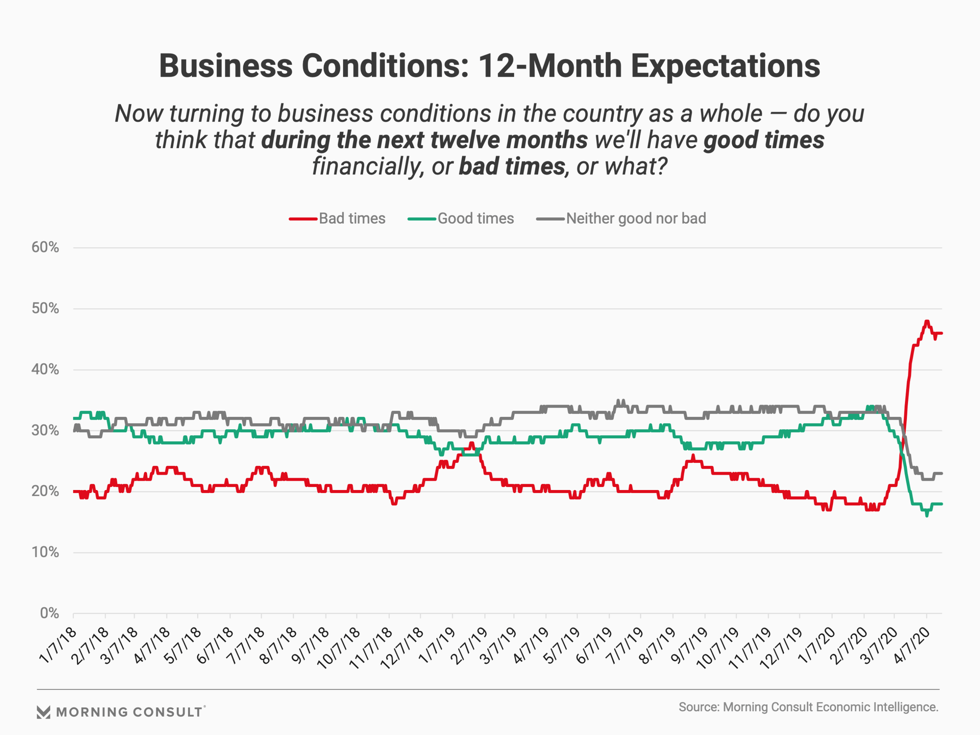 Similarly, the percentage of respondents who answered that they expect that 12 months from now business conditions in the country as a whole will be worse than they are now peaked at 48 percent on April 8 and have since slipped to 46 percent as of April 21. The percentage of respondents who believe that business conditions in the country as a whole will be better 12 months from now increased from 16 percent on April 7 to 18 percent on April 21.