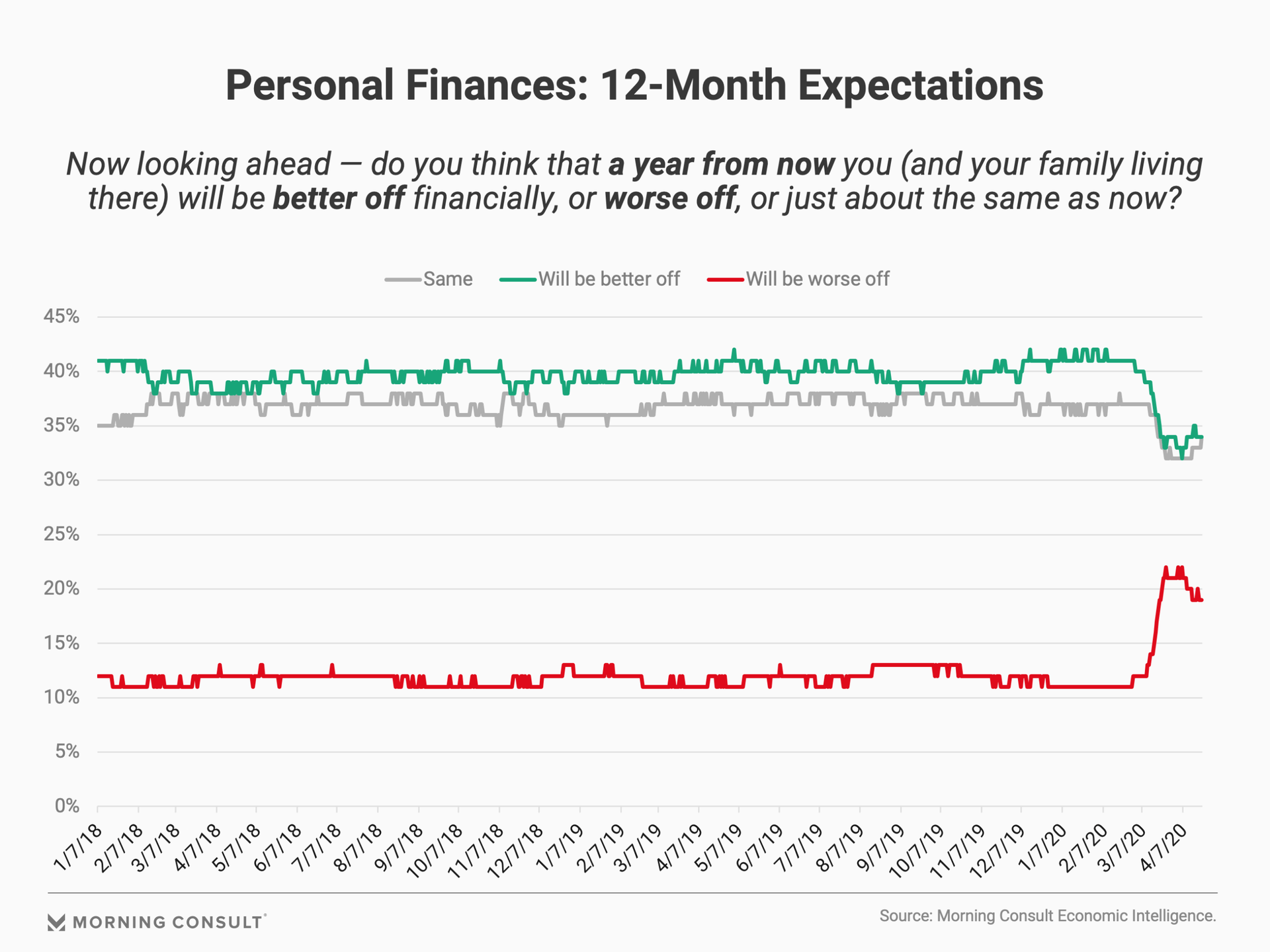 Rather, consumers’ expectations of their personal financial conditions and of business conditions in the country are responsible for the recent rebound in consumer confidence, with the largest improvement coming from consumers’ expectations over the next 12 months. The percentage of respondents who answered that they believe they’ll be worse off financially in 12 months fell 3 percentage points from April 6 to April 21, and it currently stands at 19 percent. The inverse is true for the percentage of respondents who believe they’ll be better off financially in 12 months. It increased by 3 percentage points during the same time period.