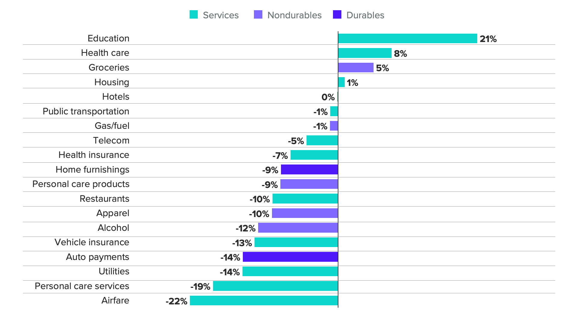 Morning Consult’s measure of real average spending declined 3.4% month over month in November, while real retail sales fell at an annualized rate of 7.8%. Throughout most of 2022, consumer spending growth has held up remarkably well, considering the degree to which sentiment has plummeted amid persistently high inflation. However, category-level trends suggest pockets of support may be growing scarce. While services spending continues to expand for certain categories, Morning Consult’s data showed diminished momentum for discretionary services, such as travel, that benefited from this summer’s pandemic-driven rebound. Spending on durable goods like autos also slipped lower in November after contributing positively to personal consumption expenditures during the previous month.