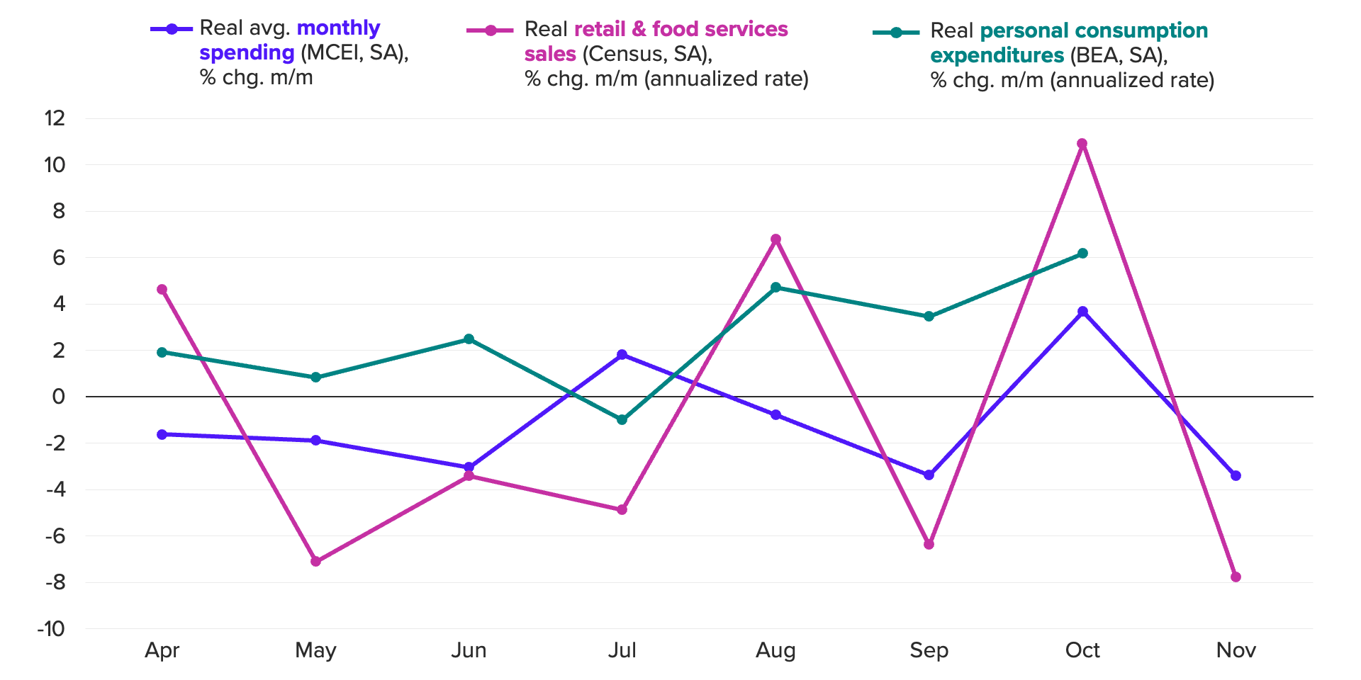 November appeared to bring a sobering return to softer spending growth after slowing inflation and rising wages coincided with a boost in outlays during the previous month. Morning Consult’s spending data showed a decline in overall spending since October, and the U.S. Census Bureau’s measure of retail sales contracted in both real and nominal terms. Meanwhile, signs of possible price relief are continuing to accumulate, suggesting the grip of inflation may loosen further in the coming months.