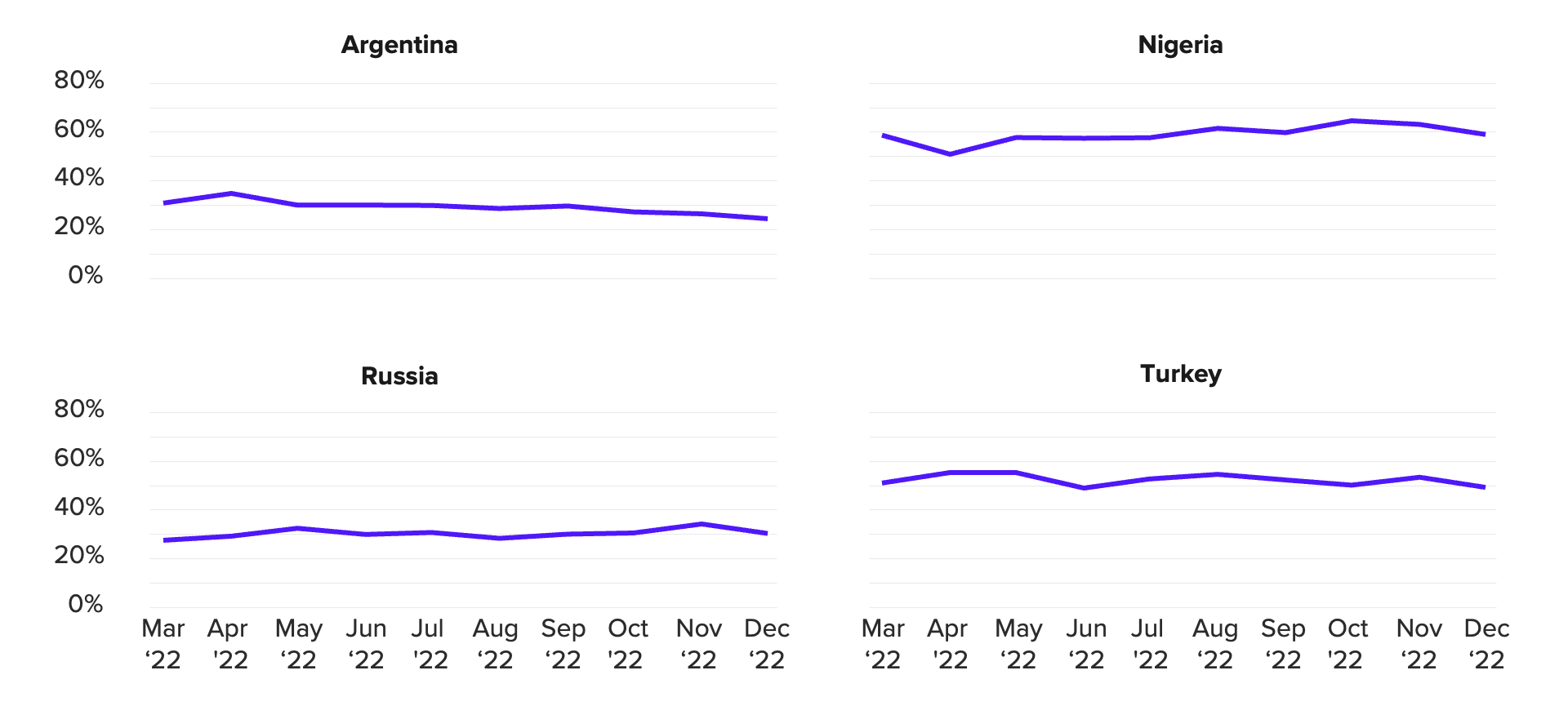 We see several potential explanations for persistent crypto adoption despite collapsing trust globally. While the relationship between inflation and cryptocurrency adoption is unclear, some evidence points to the preservation of savings in capital-restrictive, high-inflation environments as one use case. Accordingly, Argentina and Turkey, both countries with high inflation rates and foreign exchange controls, see high levels of grassroots cryptocurrency adoption. Facilitating cross-border commerce in countries facing sanctions, and serving as a store of value amid pronounced economic uncertainty unrelated to inflation, are two other potential use cases. Russia and Nigeria — two countries where grassroots crypto adoption rose in 2022 — both fit this mold.