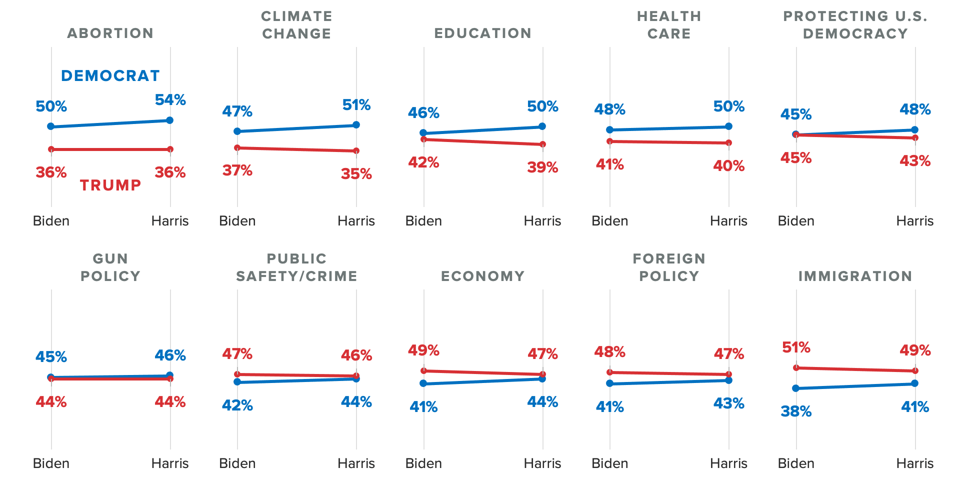Harris has widened the trust advantage that was held by Biden on handling abortion (her biggest lead), climate change, education, health care and protecting American democracy, while the numbers between her and Trump are much closer than they were between Biden and Trump when it comes to gun policy, crime, the economy and foreign policy.