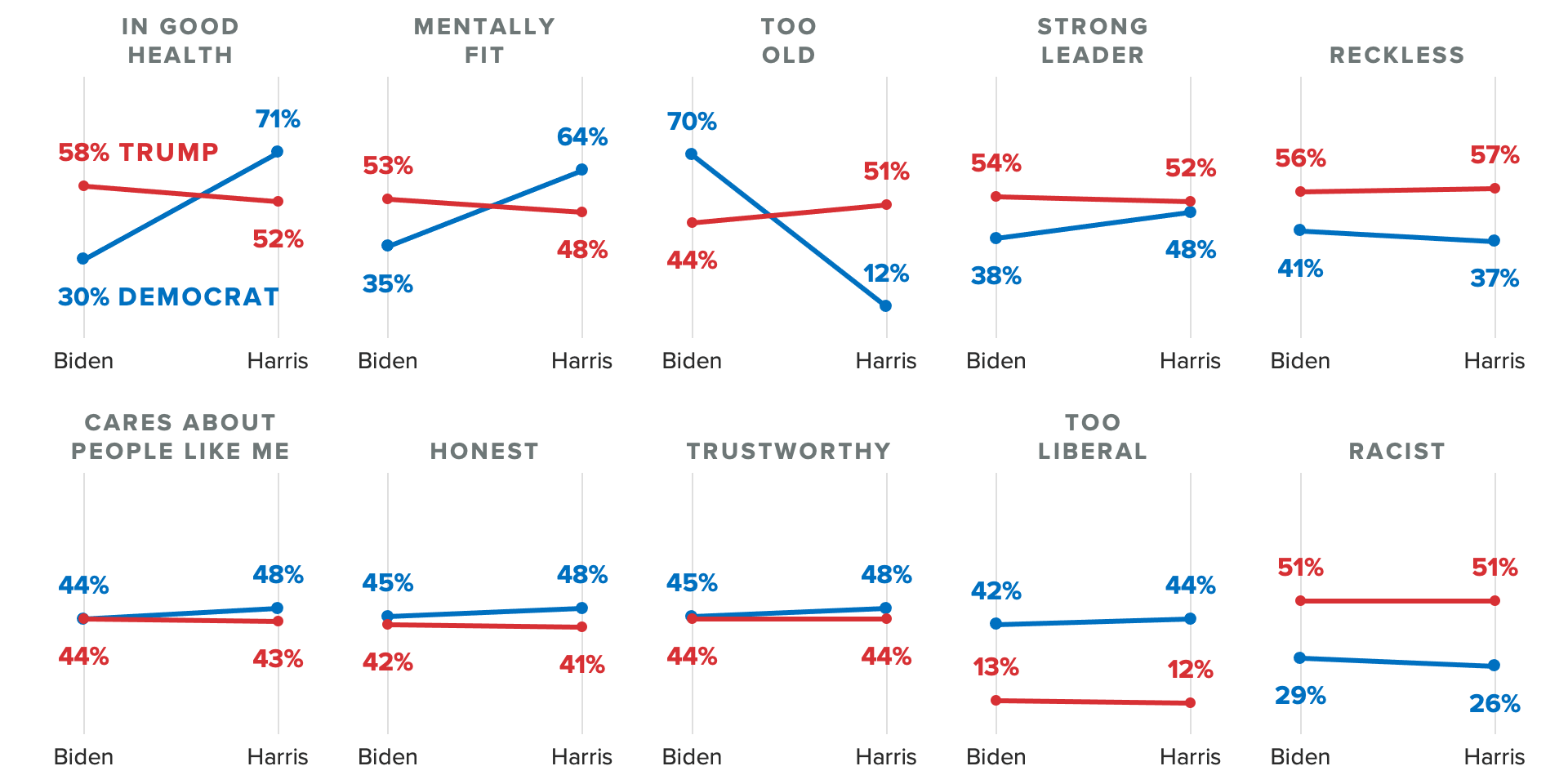 Compared with Biden before he ended his campaign, our latest survey shows voters nationwide are far more likely to say Harris is in good health (71% to 30%), mentally fit (64% to 35%) or a strong leader (48% to 38%).