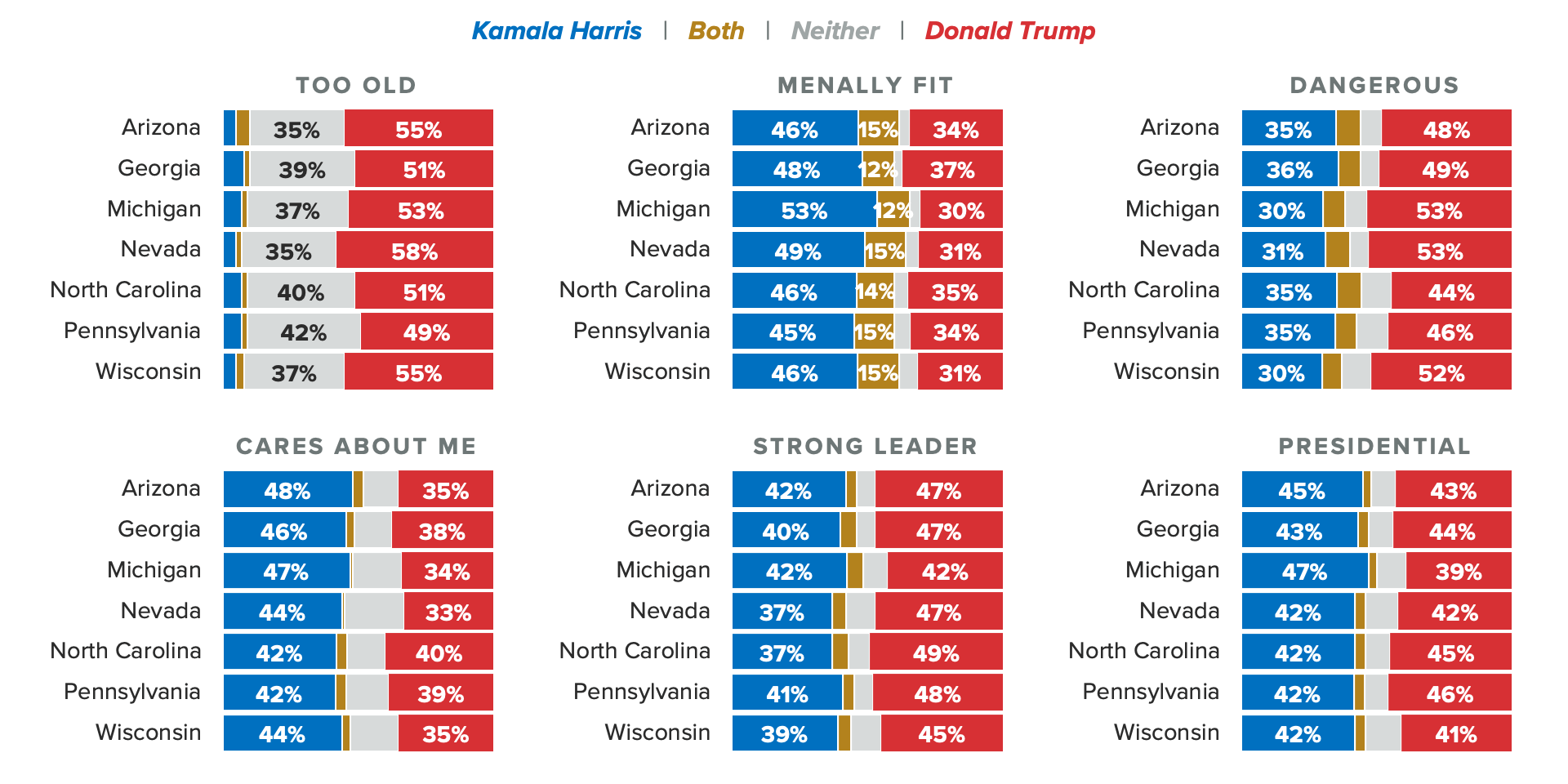 While Harris leads Trump on the question of “cares about people like me” in each of the seven swing states surveyed, the two compete over the “presidential” descriptor and Trump has a slight advantage on the question of who is a “strong leader.” Along with the half of voters nationwide that now say Trump is “too old,” similar shares say the same in the swing states even.
