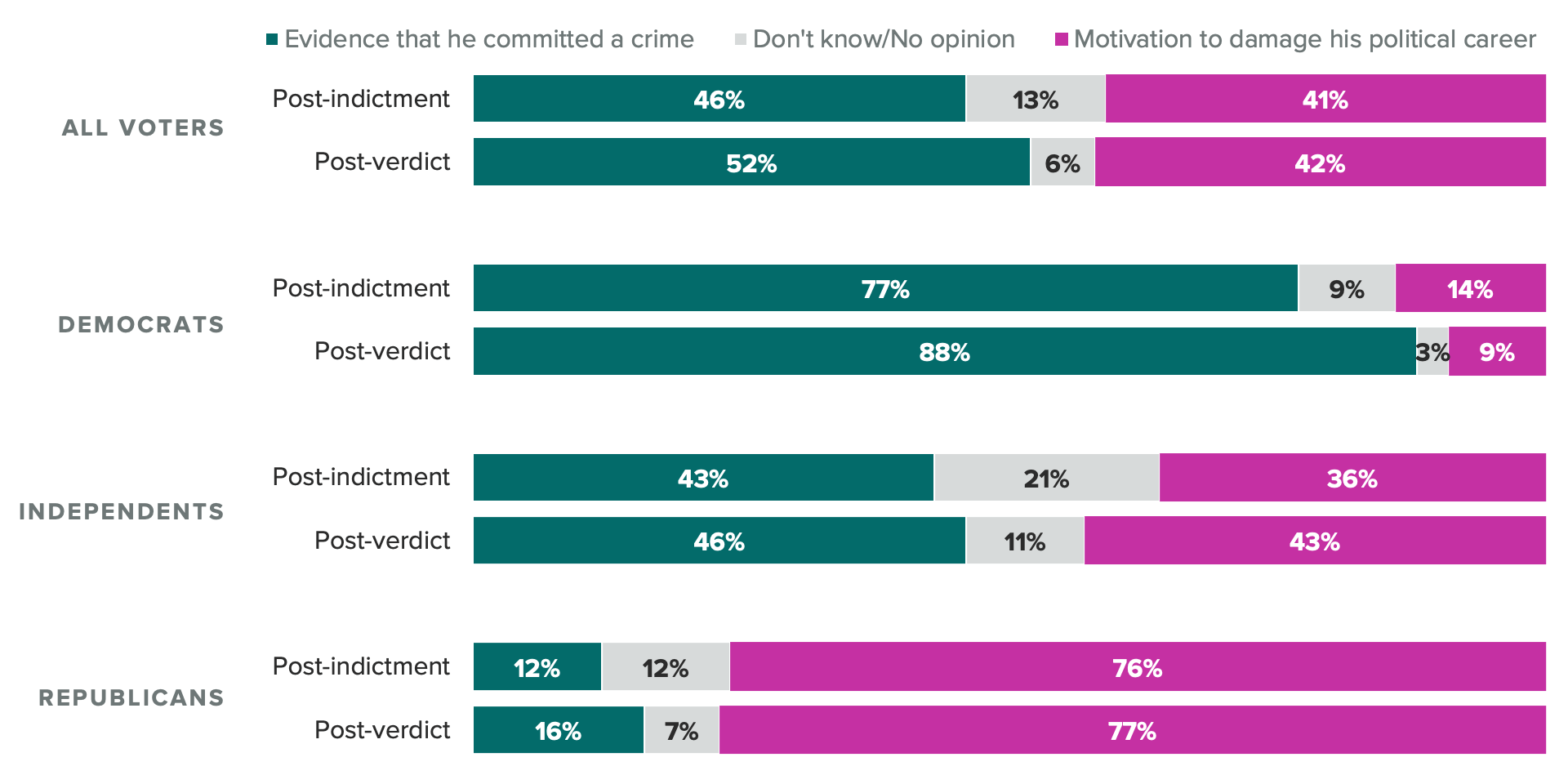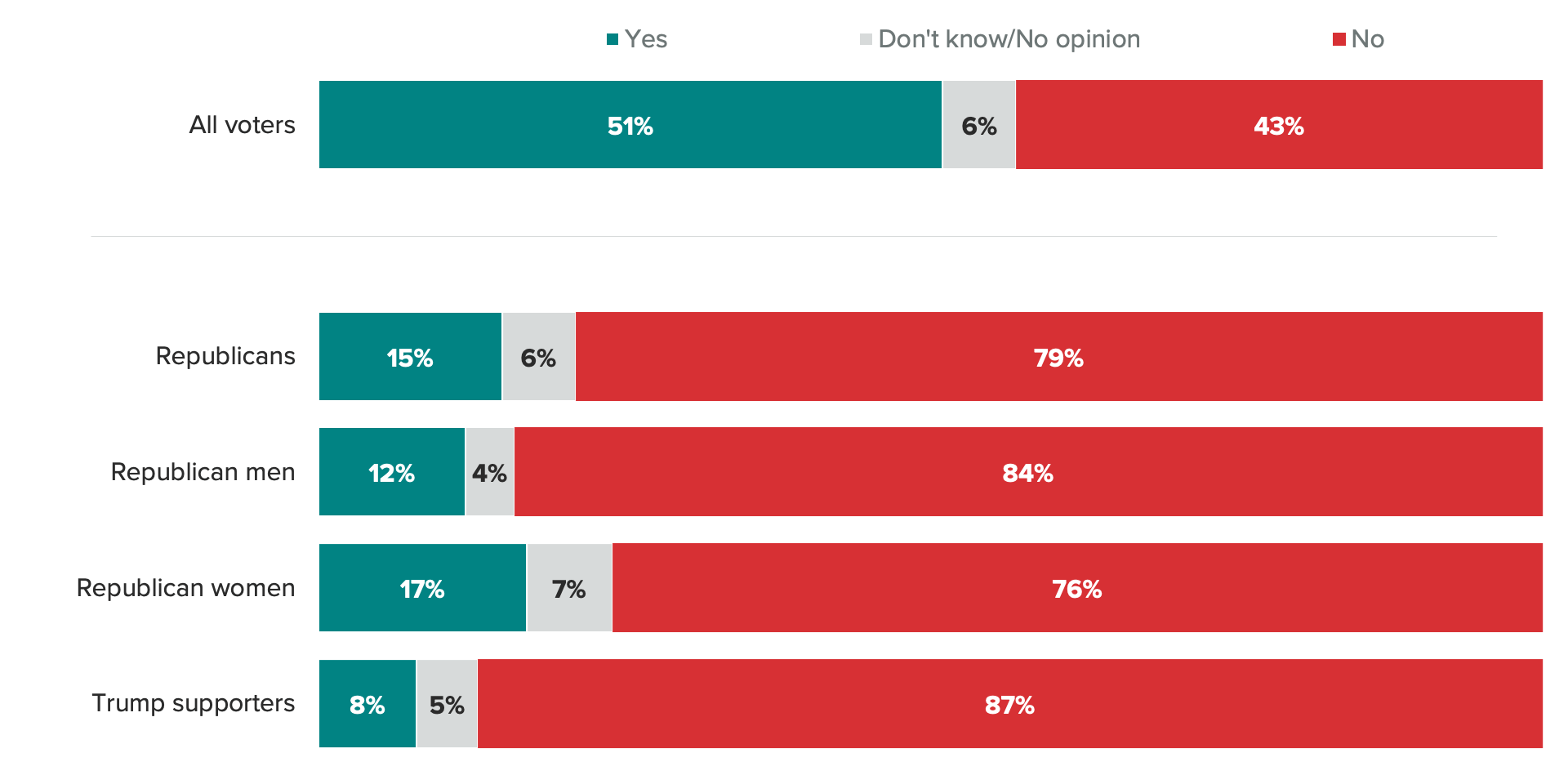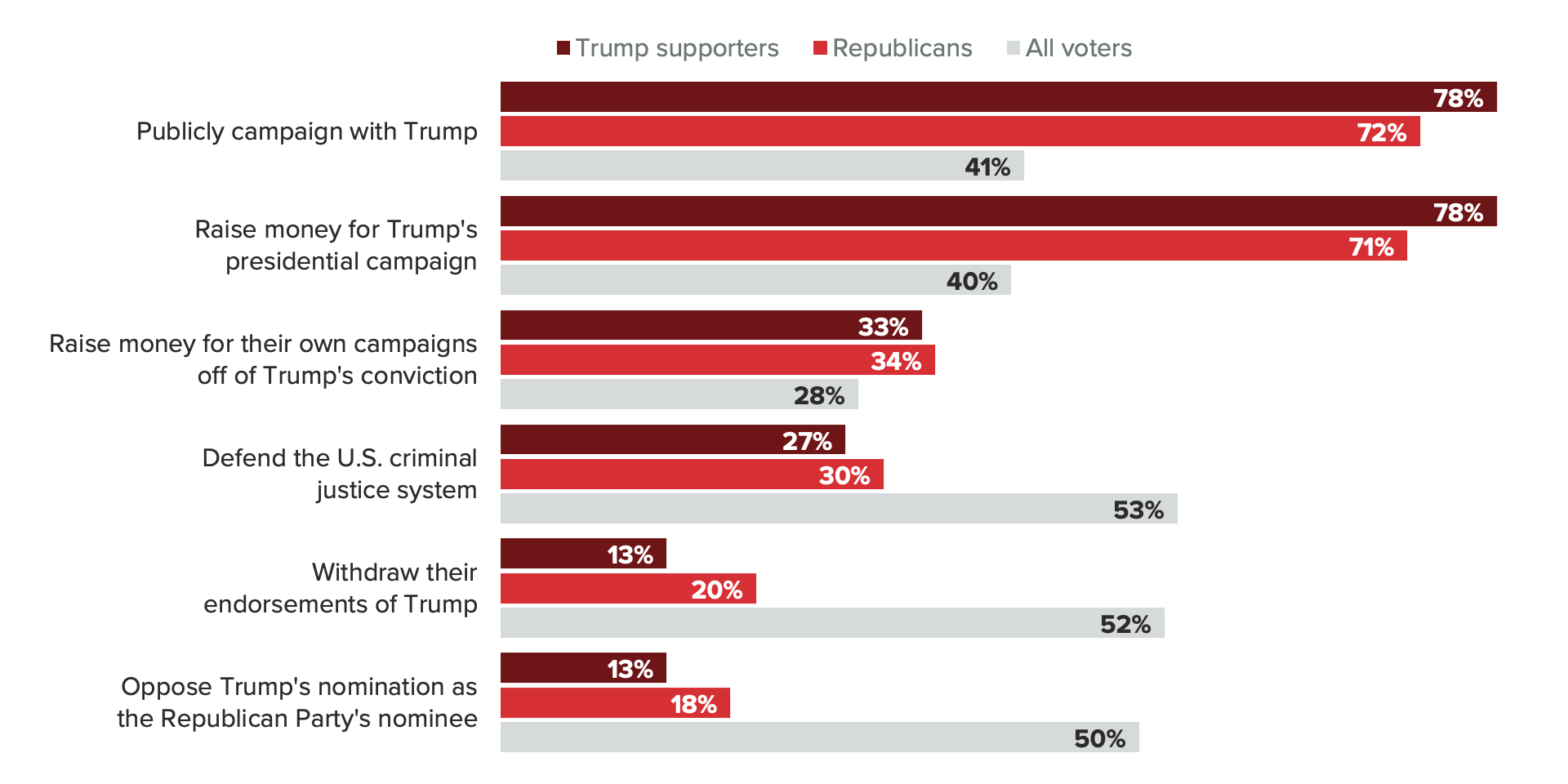 Just over a quarter of Trump voters (27%) said GOP politicians should defend the criminal justice system following Trump’s conviction, compared with 53% of the overall electorate that said the same.
