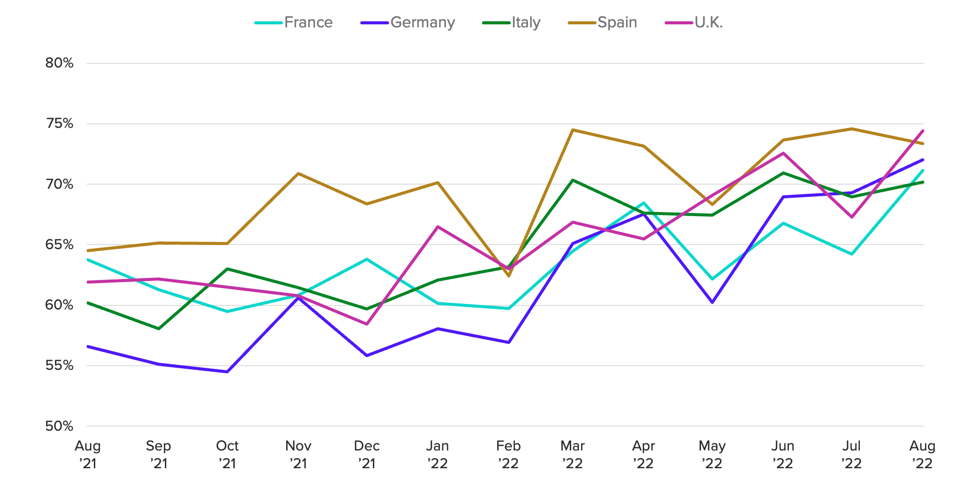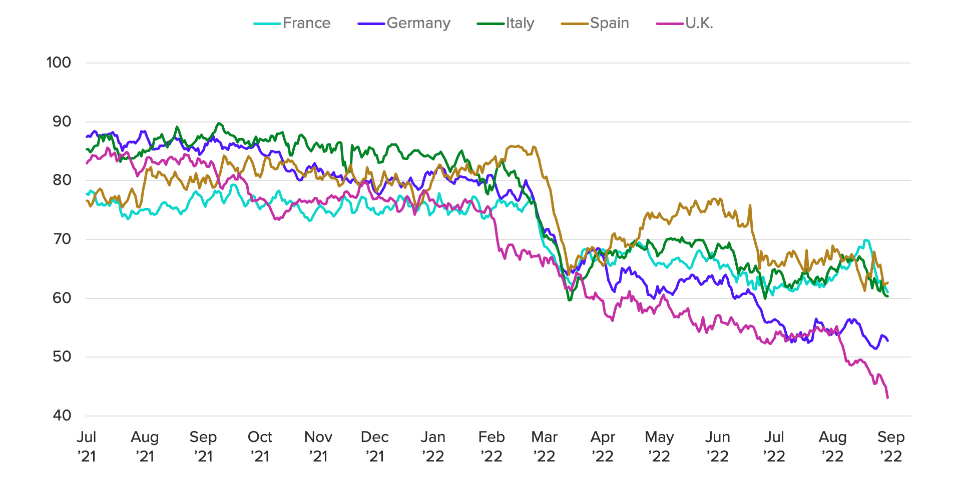 In Germany, consumer confidence also continues to tumble. Through Aug. 31, 2022, the Morning Consult Germany ICS was down 35.3% from where it started the year. While confidence in France, Spain and Italy has held up better, the ICS in those countries was down 18.1%, 21.4% and 28.0%, respectively, over the same period. Germany has been heavily reliant on cheap Russian gas to heat homes and fuel its export-driven economy, and without it, the growth outlook has deteriorated substantially. Germany had one of the weakest rates of real GDP growth in Europe in the second quarter of 2022, at 1.7% year over year, and may well tip into recession in the coming quarters.
