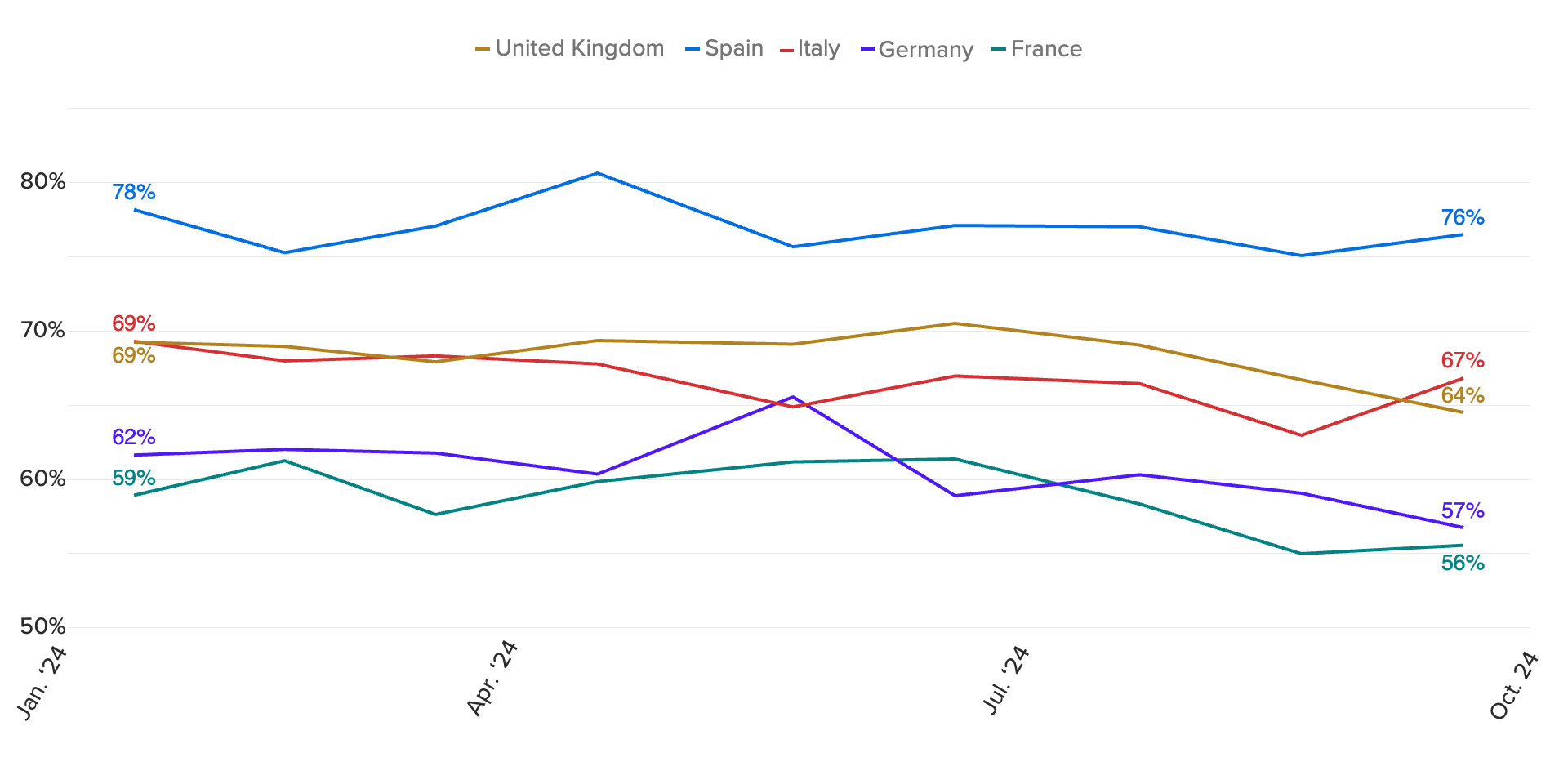 Since January 2024, there has been a decline in average public support for corporate action on hot-button social issues across the five largest European economies: France, Germany, Italy, Spain and the United Kingdom. Of the issues we examine — climate change, unionization, abortion access, racial equality and transgender rights — the largest decline has been in support for corporate action on racial equality.