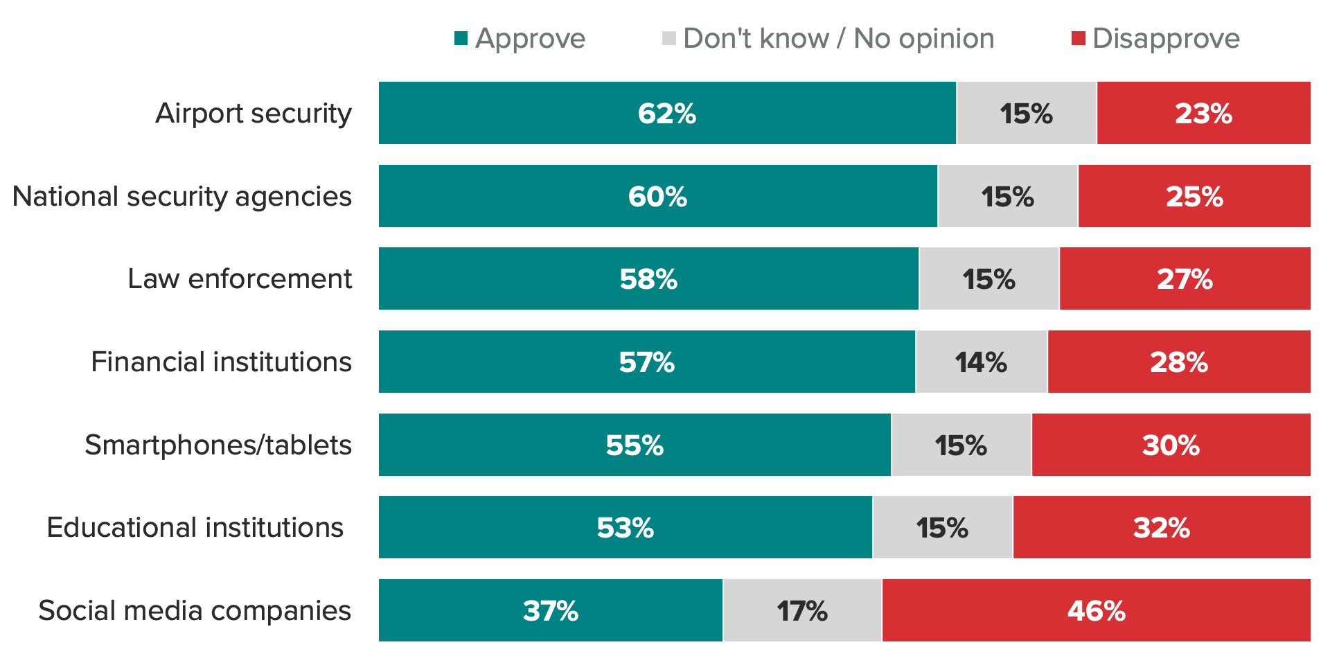 For example, majorities of Americans approve of the use of facial recognition software by TSA, national security agencies, law enforcement, banks and financial services institutions, schools and universities and devices such as smartphones and tablets. Meanwhile, just 37% of Americans approve of social media companies’ usage of facial recognition tech.