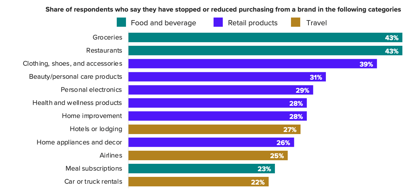 Increasing cost of living is the primary reason shoppers are abandoning their favorite brands. Consumers say they’ve been spending more money first and foremost on groceries, restaurants and apparel. These are the same categories where shoppers say they’ve either stopped shopping from a brand or shopped that brand less frequently. Cutting back on food leads the list, where consumers are giving up brands in order to save money. Most (66%) shoppers who have reduced their shopping with a brand say they’re just buying less frequently and haven’t given up on their favorites entirely. Download our full report to see how customer loyalty is shifting.