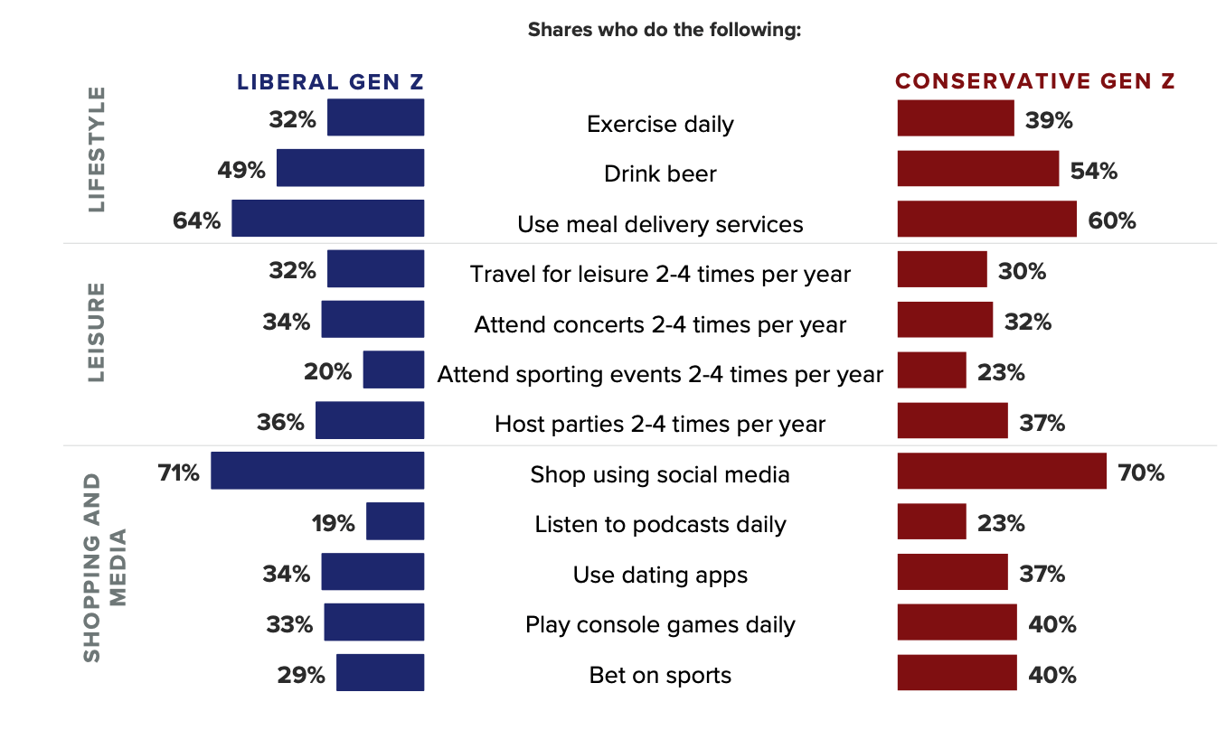 To some extent, yes — but only when these behaviors are traditionally tied to a specific gender. For example, we know young conservatives skew male. We also know that sports fandom skews male. So, it’s unsurprising that conservative Gen Zers are several points more likely than their liberal counterparts (who skew female) to say that they do things like exercise daily, regularly attend sporting events and bet on sports. That said, the influence of gender weakens when it comes to bigger-tent consumer activities like online shopping, traveling and hosting get-togethers. Roughly equal shares of both groups report participating in these behaviors at the same frequency. Download our full report for a deep dive into Gen Z's shifting ideology, and what it means for leaders in the public and private sector.