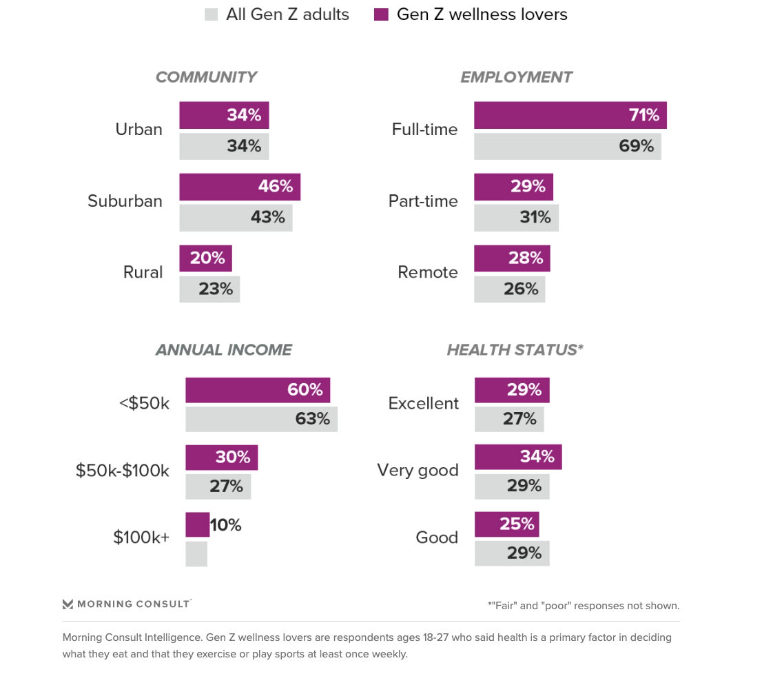 When it comes to general demographics, Gen Z wellness lovers — defined in this analysis as those aged 18-27 who report eating healthy and exercising or playing sports at least weekly — don’t differ all too much from their larger generational cohort. They hold college degrees and reside in various settings (urban, suburban, rural) at roughly equal rates. And while Gen Z wellness lovers are slightly more likely to be employed full-time and make at least $50,000 annually than all Gen Z adults, the most notable gap comes (unsurprisingly) in relation to how they categorize their well-being: More than 3 in 5 (63%) of the former describe their health as “excellent” or “very good,” compared to 56% of the latter. Learn more about the Gen Zers obsessed with wellness here.