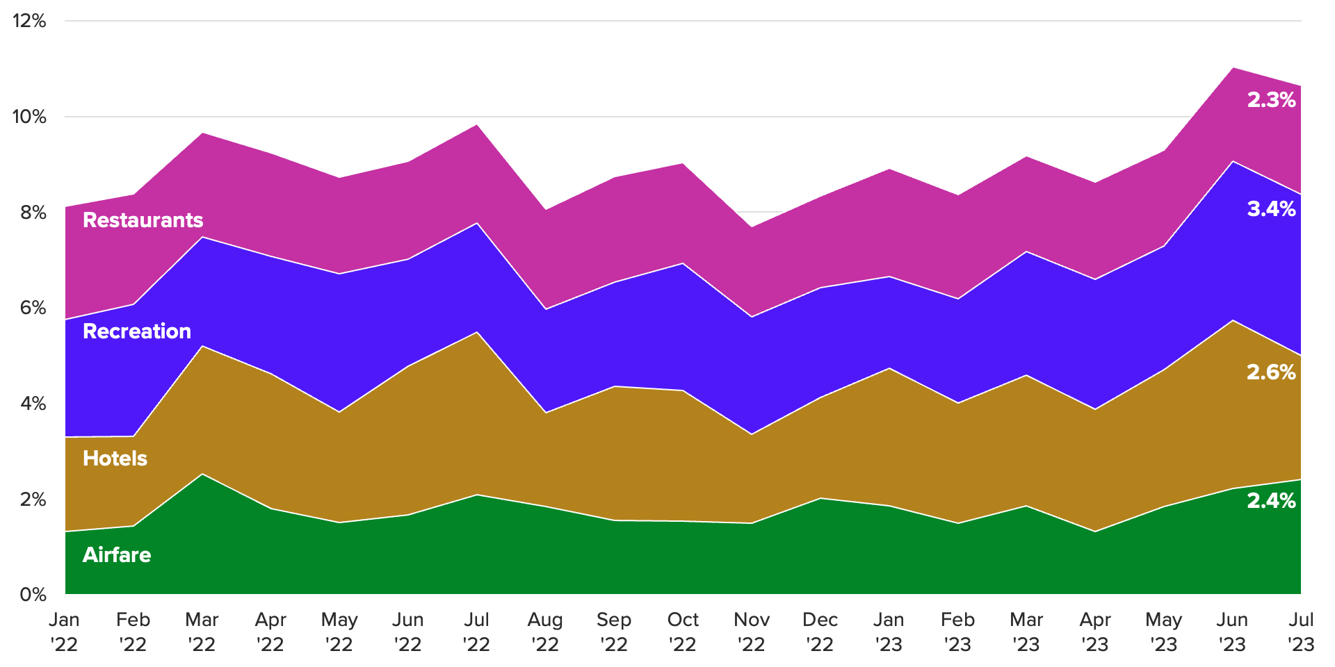 Younger generations have largely been behind the increase in discretionary services spending, particularly in recent months. Gen Z adults exhibited a similar jump in discretionary services spending in summer 2022. However, the 2023 bump in outlays surpassed last year’s level and included participation from millennials as well. These younger consumers are increasingly prioritizing services like travel and recreation, resulting in higher spending levels and a greater share of wallet allocated to these categories relative to a year ago.
