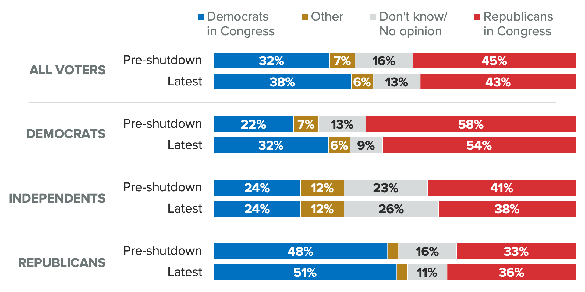 Regardless of whom voters blame for how they occur, history shows that both parties tend to suffer in the court of public opinion during shutdown. However, our data shows this latest impasse is thus far only bringing blowback for Democrats in Congress.
