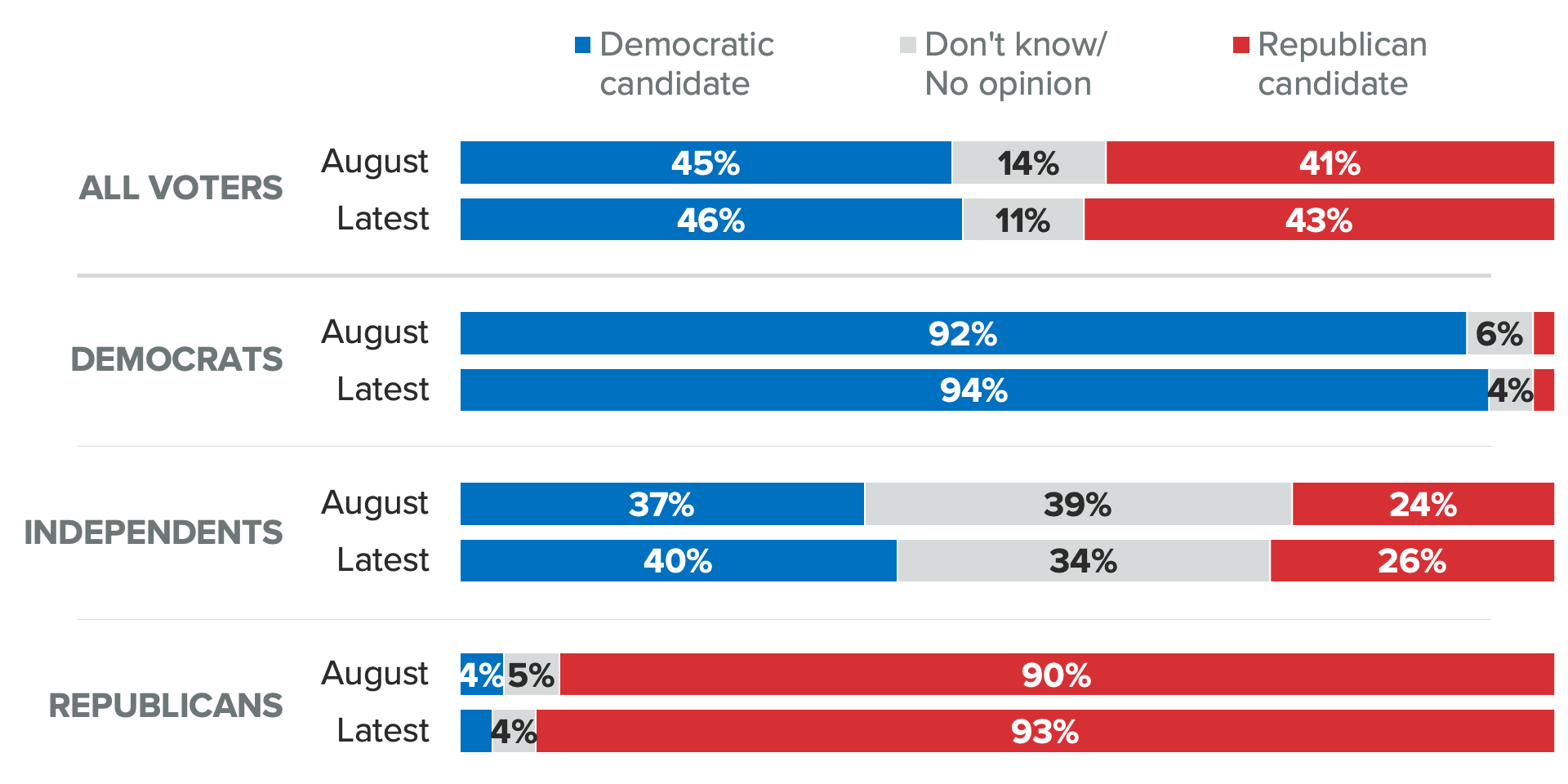 Democrats lead Republicans by 3 points on the generic ballot, down from a 4-point edge in August, and well within the surveys’ 2-point margins of error.