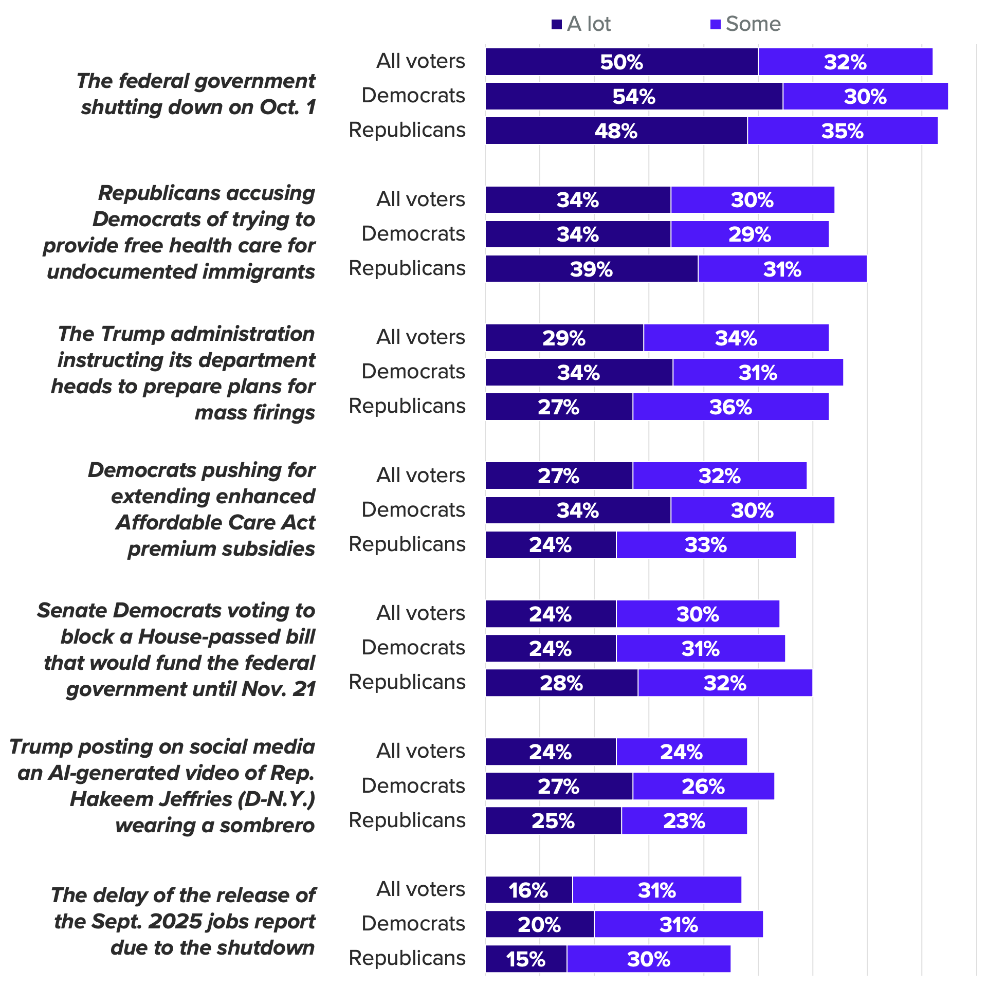 For example, 34% of voters said they had heard a lot about Republicans’ accusations that Democrats are trying to provide free health care for undocumented immigrants, compared with 26% who said the same of Democrats’ push to extend enhanced Affordable Care Act premium subsidies before they expire at the end of the year. (Having said that, our so-called net buzz rating on health care — the share who heard something positive minus the share who heard something negative about it over the past week — fell to a record low.)
