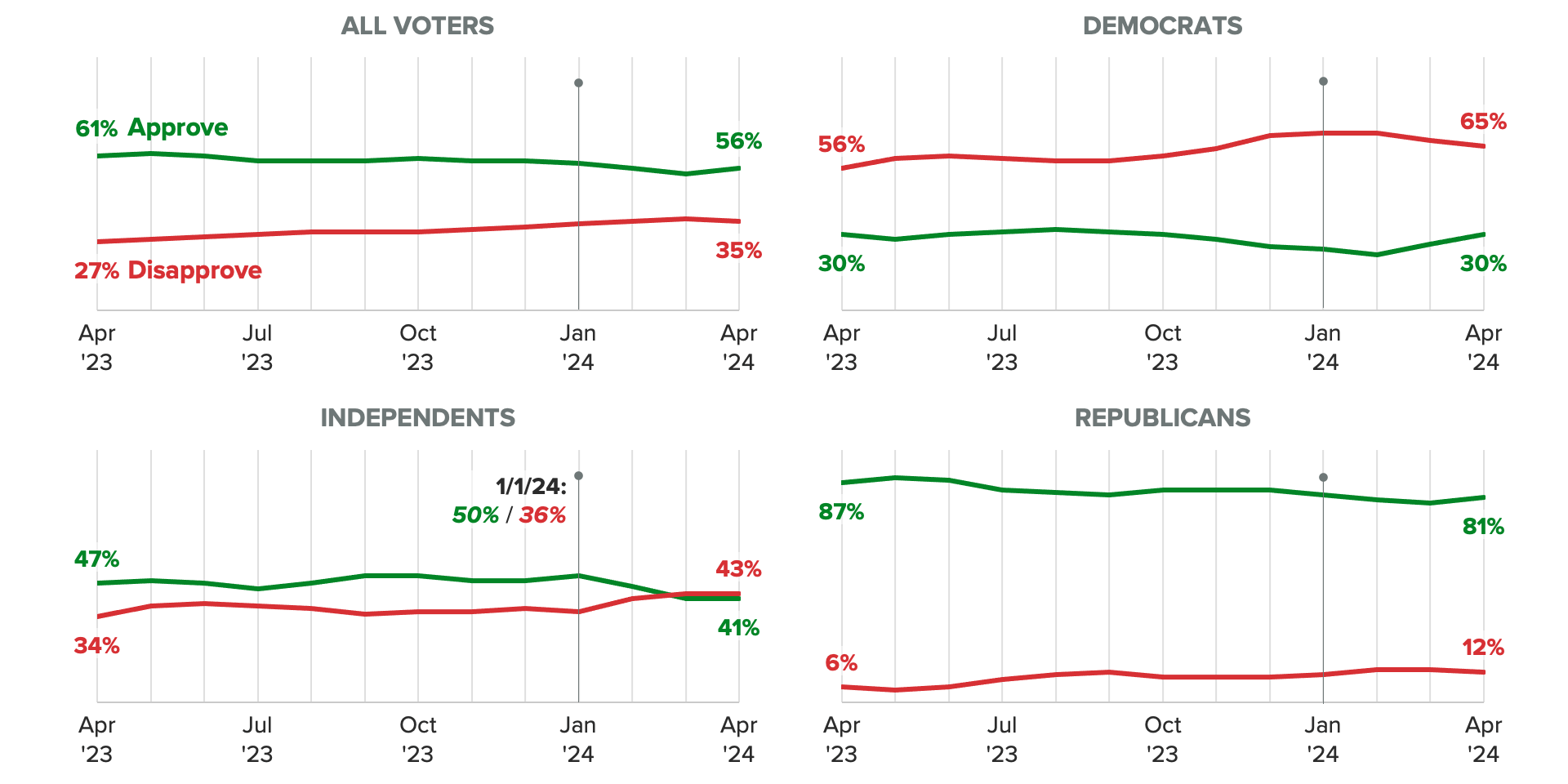 According to surveys conducted in the first quarter of 2024, 56% of Arkansas voters approve of Sanders’ job performance, compared with 35% who disapprove. Over the past year, it marks a 13-point decline in her net approval rating, which measures the share who approve minus the share who disapprove, with little change in awareness about her given her national prominence as she’s weathered a lectern scandal and ethical questions about her travel.