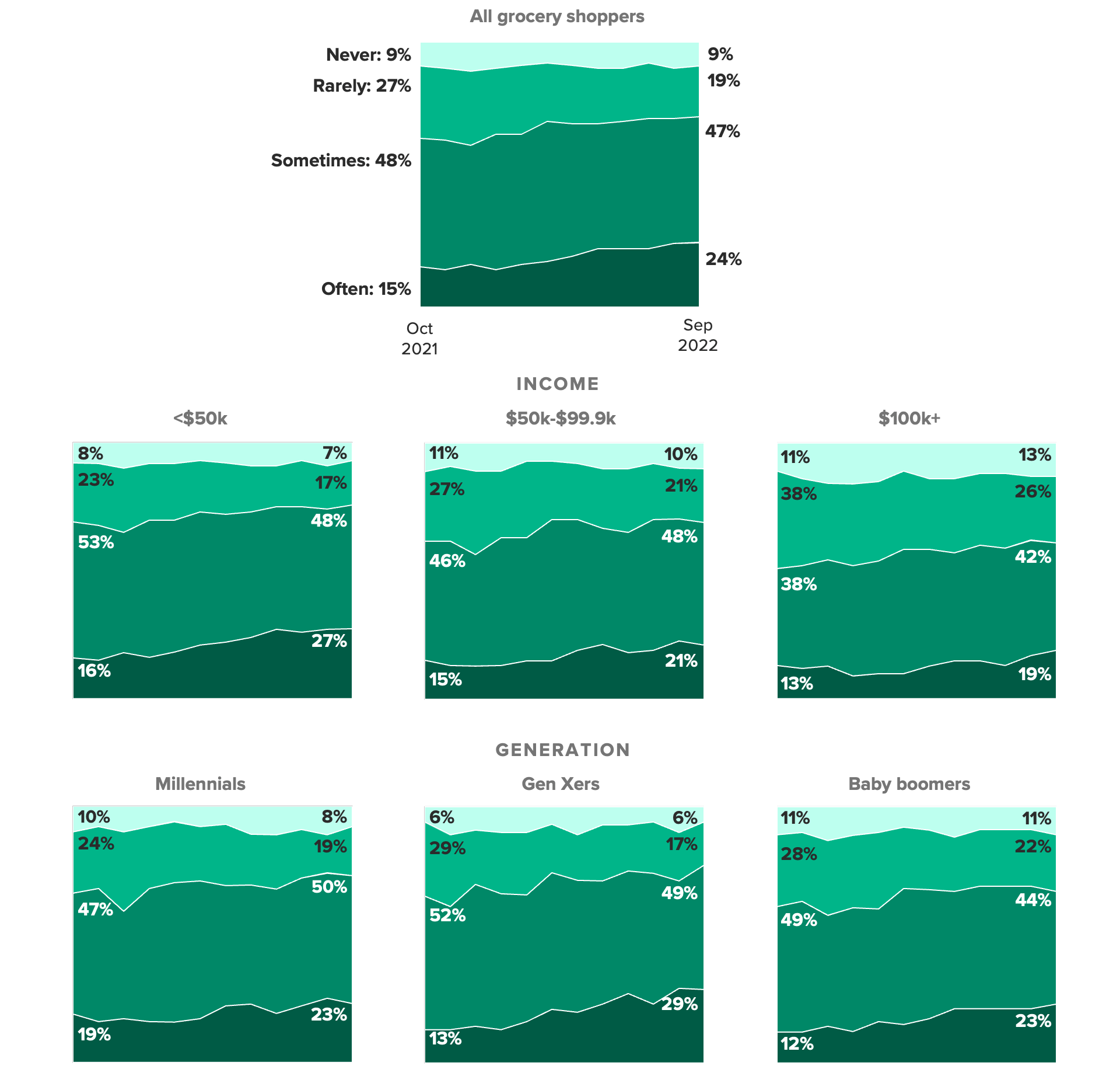 The share of grocery shoppers who said they often purchased fewer items to save on their grocery bills climbed from 15% in October 2021 to 24% last month. Meanwhile, the share buying items in bulk to save money stayed relatively stable over the same period, indicating this is not a case of people making fewer purchases but in larger quantities. While the shares using these cost-saving tactics vary by income and generation, each demographic increasingly reports purchasing fewer items.