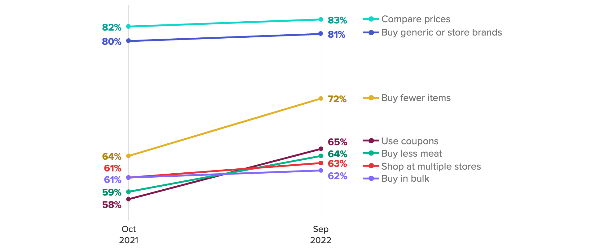Amid widespread concern, shoppers are employing myriad tactics to save on grocery bills. In our latest survey, 82% of shoppers said they at least sometimes made an effort to save on groceries in the past month because of inflation. The most common cost-saving actions are comparing prices and buying generic or store brands instead of name brands. Consumers have consistently relied on these tactics, but recently a growing number have been employing a different approach: buying less overall.