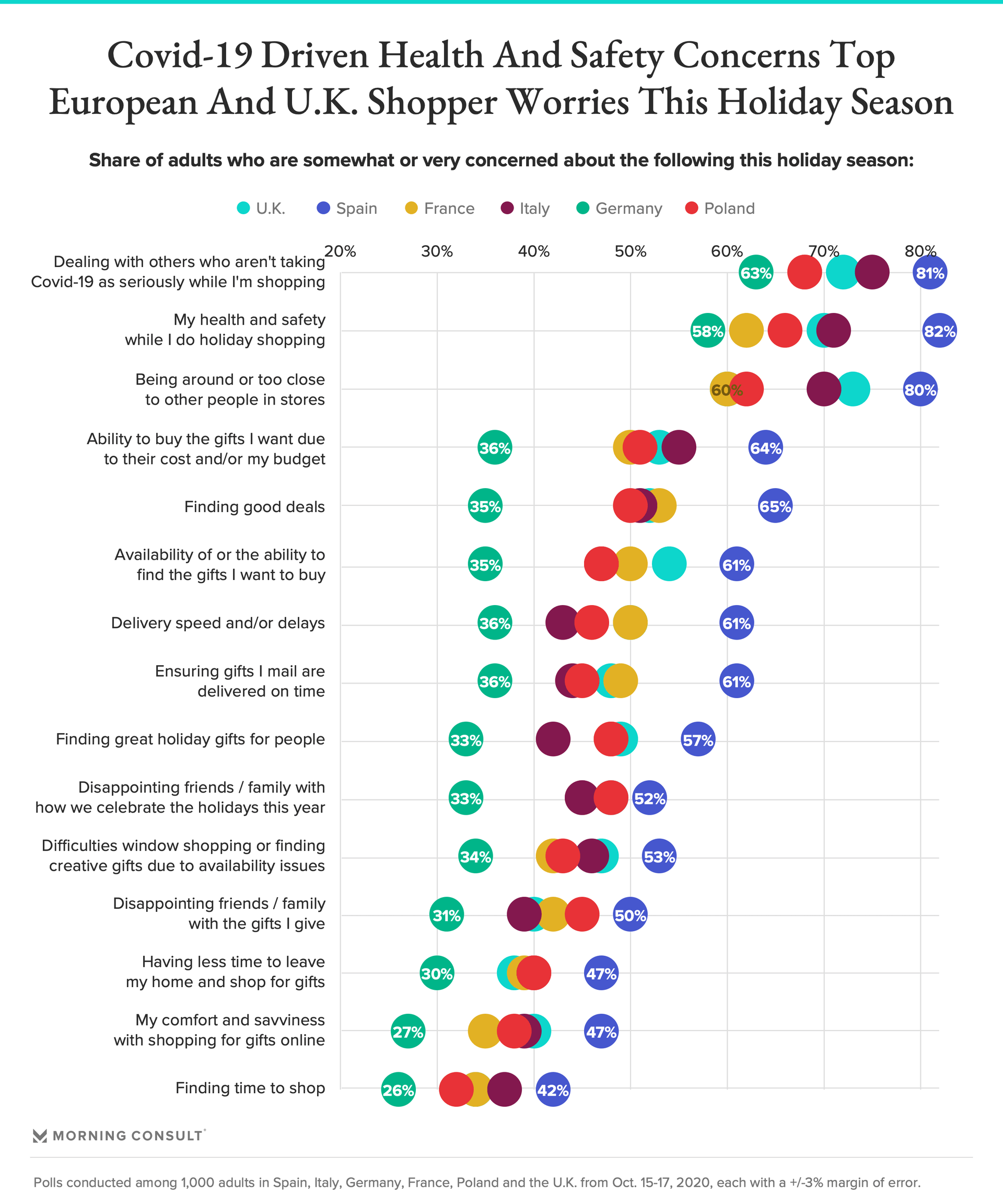 These comfort levels reflect concerns expressed about this holiday season, some of which seem to be universal across key European markets. These include dealing with others who aren’t taking COVID-19 as seriously, being around or too close to others in stores and -- related -- their health and safety while doing holiday shopping. Other concerns, however, are more market-specific: