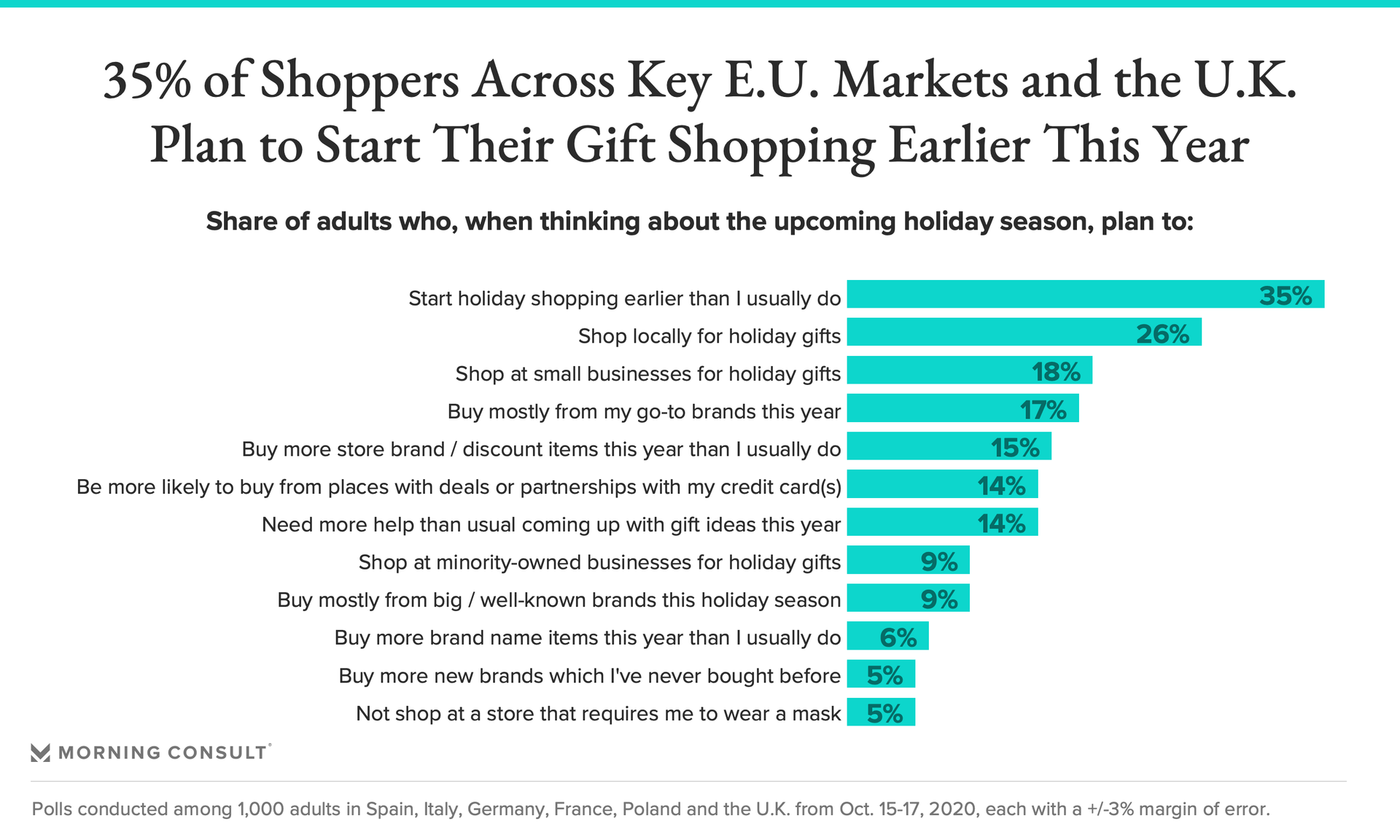 New research conducted Oct. 15-17 in the United Kingdom, Spain, France, Italy, Germany and Poland among 1,000 adults in each market aims to shed light on how the convergence of ongoing concern around the coronavirus, increased anxiety stemming from recent resurgences, and potential nostalgia, joy or relief associated with the holidays will translate for brands this season across key European markets.