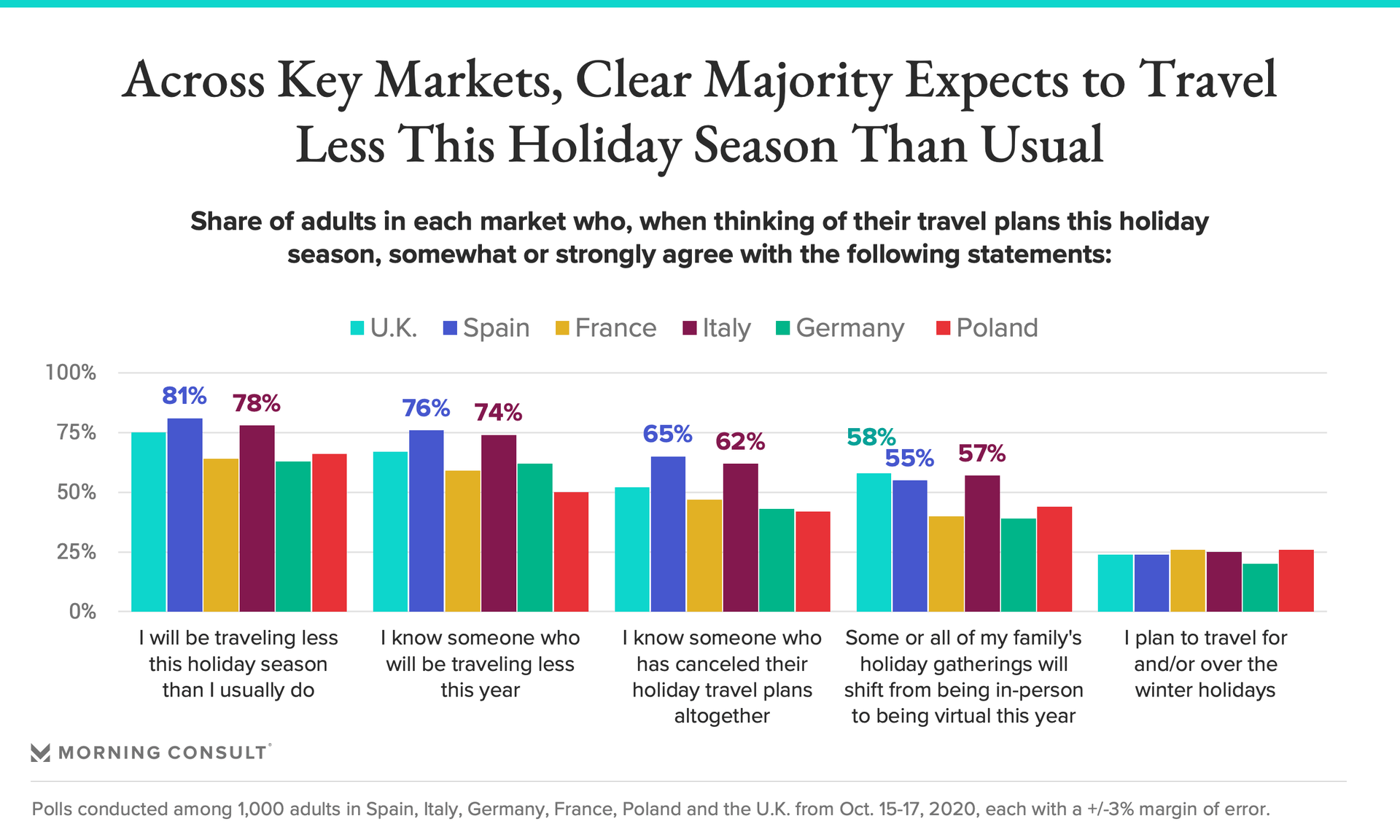 Across markets, a clear majority expects to travel less than usual this holiday season, and knows someone who will be traveling less this year, reinforcing hesitations toward and the unpopularity of doing so. Indeed, with minimal variance across markets, only around a quarter of Europeans (24 percent on average) plan to travel over the winter holidays this year. While Spanish and Italians are more likely to know someone who has entirely canceled their holiday travel plans and are also more likely to say that their family’s holiday gatherings are going virtual this year, these are also true for a sizable share across all markets.