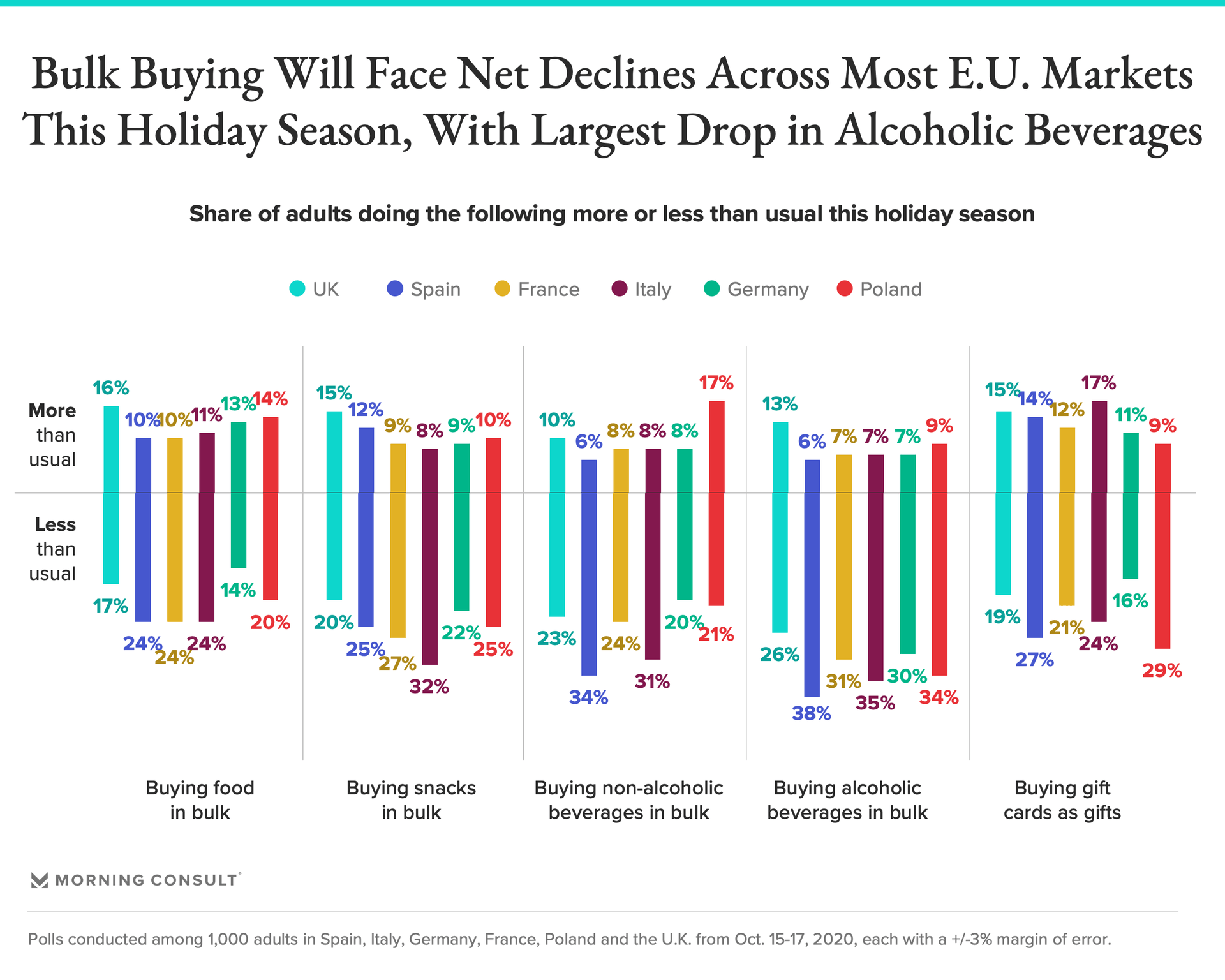 - The Spanish, French and Italians are notably more likely to buy less food in bulk this holiday season; Italians are also significantly more likely to buy fewer snacks in bulk this year.