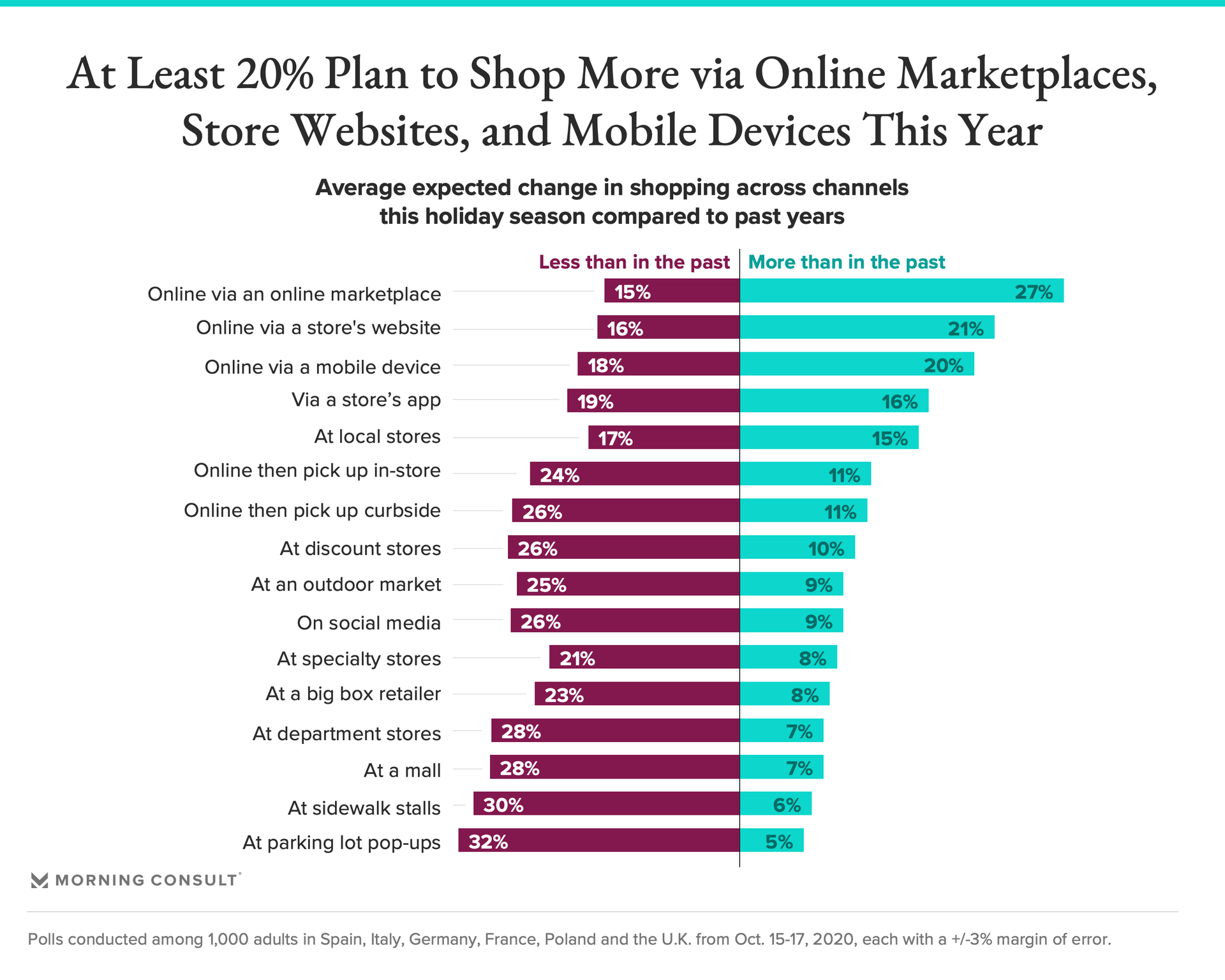 These likelihoods reflect expected changes in shopping across channels this holiday season relative to years past. Online via either online marketplaces, store websites or mobile devices will see the greatest upticks, with an average of one in five consumers across EU markets planning to use these more. Parking lot pop-ups and sidewalk stalls can expect the greatest declines in usage year-over-year — but so too can other traditional offline channels, with an average of anywhere from 21 percent to 28 percent of EU consumers expecting to shop these less in 2020.