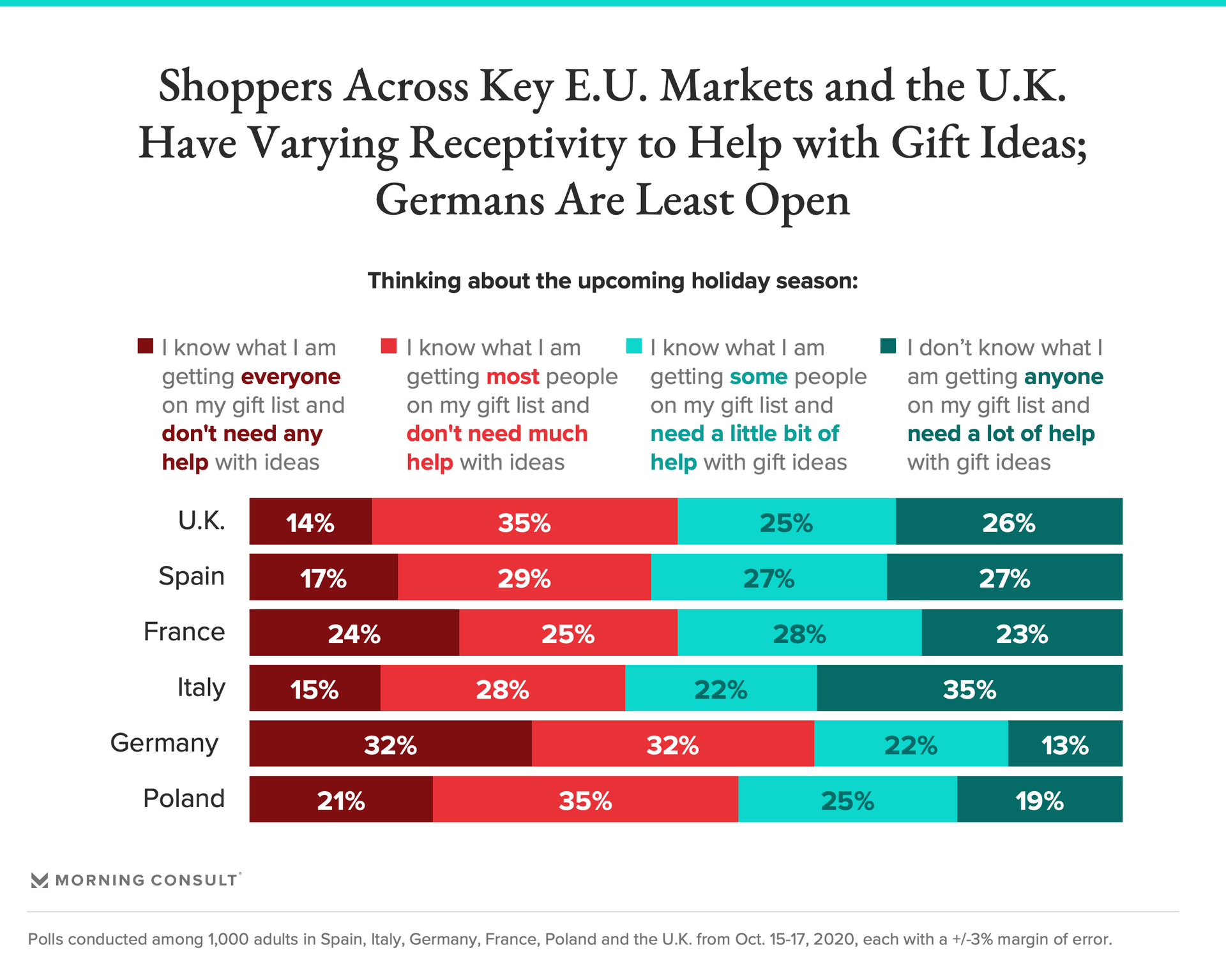 That said, it seems shoppers in some markets are more open to help with gift ideas than others. While roughly a third of Germans (32 percent) say they know what they are getting everyone on their list and don’t need any help with ideas, a slightly greater share of Italians (35 percent) doesn’t know what they’re getting anyone and could use a lot of help with ideas. Another near-third (32 percent) of Germans as well as 35 percent of both UK and Polish shoppers are mostly set with their gift lists, and don’t need much help.