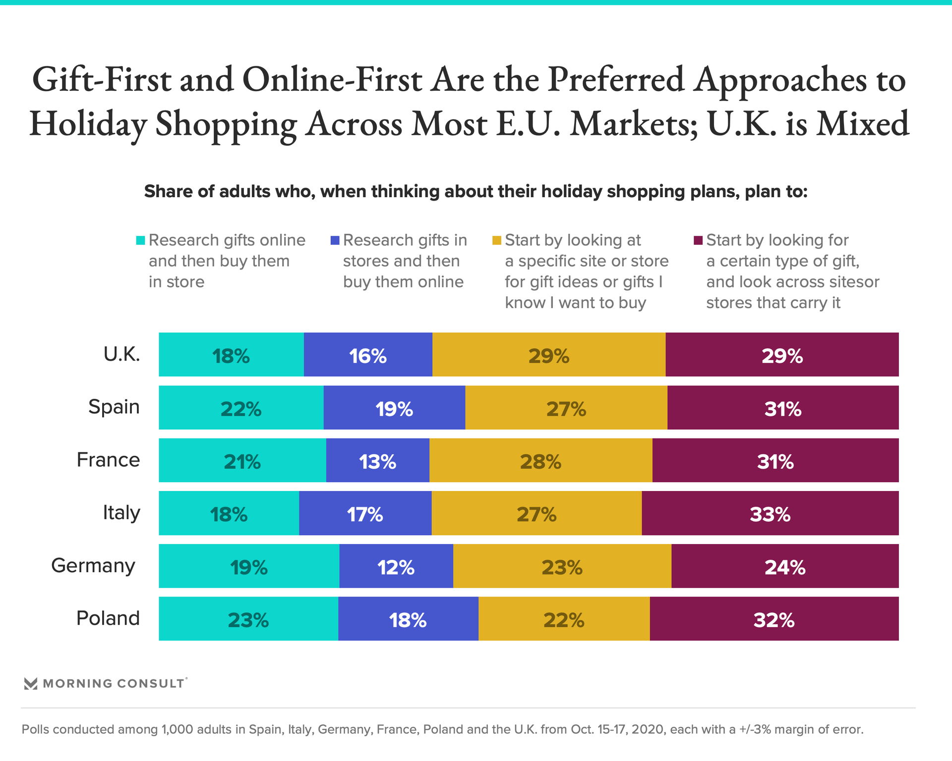 The approaches European shoppers plan to employ for gift shopping perhaps unsurprisingly vary by market. UK shoppers are most likely to do a mix of pre-planning and on-the-go discovery, while the majority of Germans and Polish shoppers plan to pre-plan. Spanish, French and Italian shoppers are also most likely to pre-plan but a sizable share -- nearly 3 in 10 -- still plan to do both equally in each of these markets.