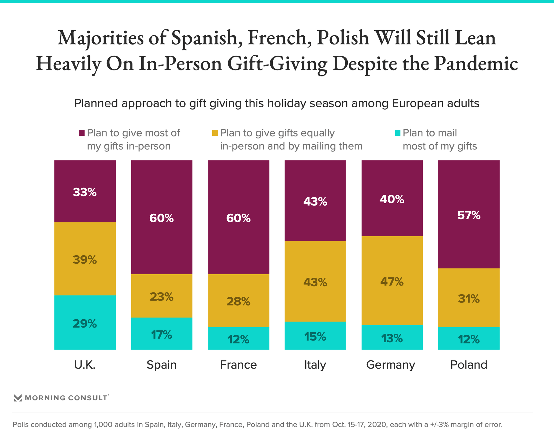 European markets and the United Kingdom are divided as to whether they will switch to mailing their gifts instead of giving them in-person: while the majority of Spanish, French, and Polish consumers plan to give most of their gifts in-person, more Germans and UK citizens plan to give their gifts via a mix of in-person and mailing. The UK is most likely to shift to mailing gifts, though under a third (29 percent) plan to do so.