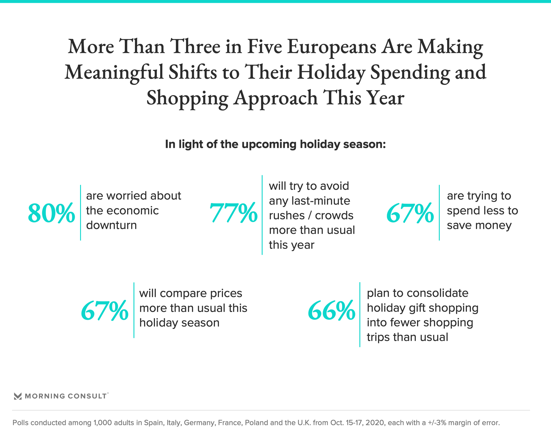 Indeed, the combination of a global pandemic stirring health concerns and economic pressures leading to financial challenges means that 80 percent of Europeans on average are worried about the economy, and that more than 6 in 10 are making meaningful shifts to their holiday spending and shopping approaches.