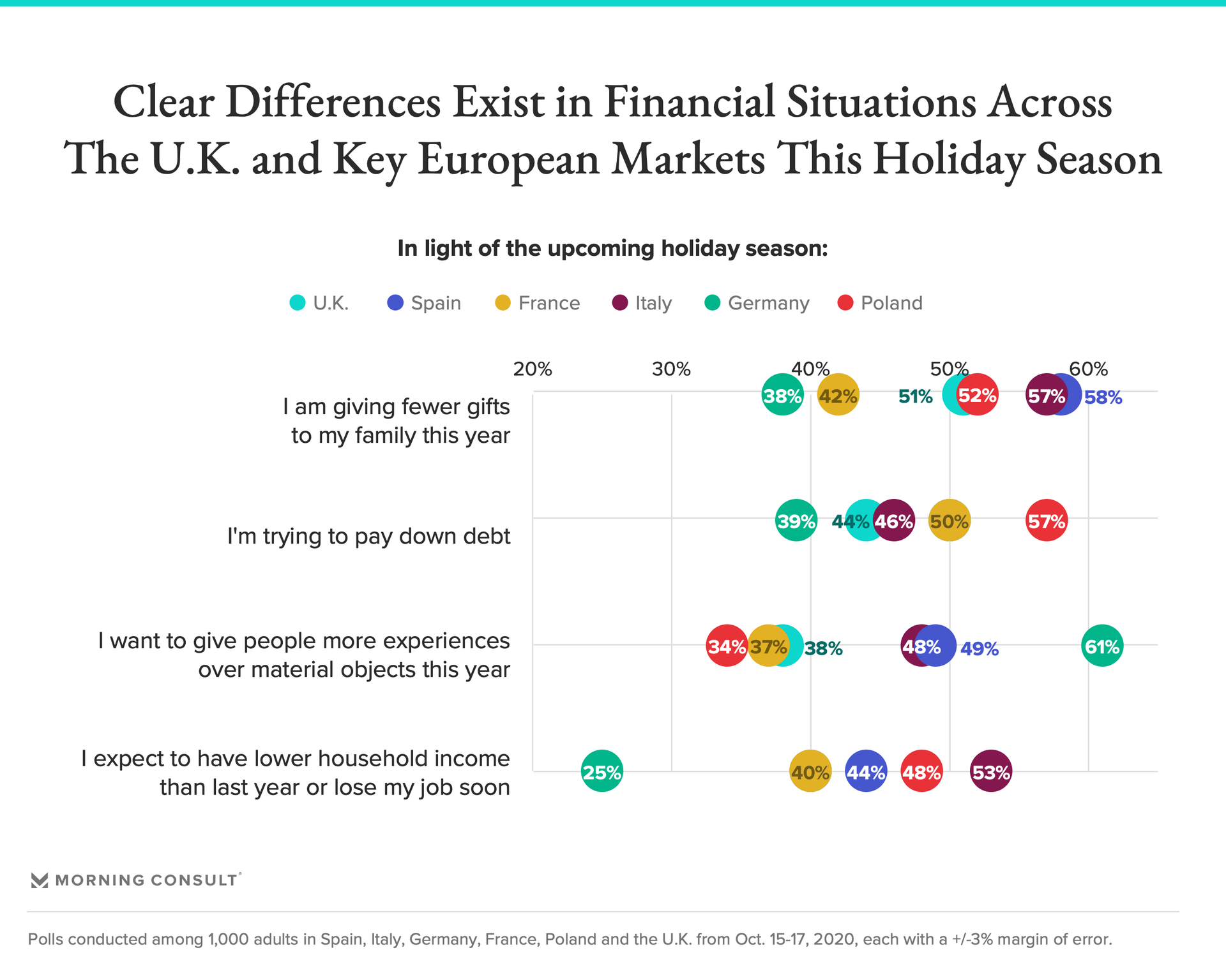 - Polish consumers are significantly more likely to be planning to gift experiences instead of material goods this year while also aiming to reduce their personal debt; Germans are again least likely to be doing each of these.