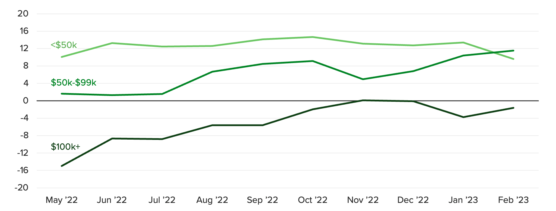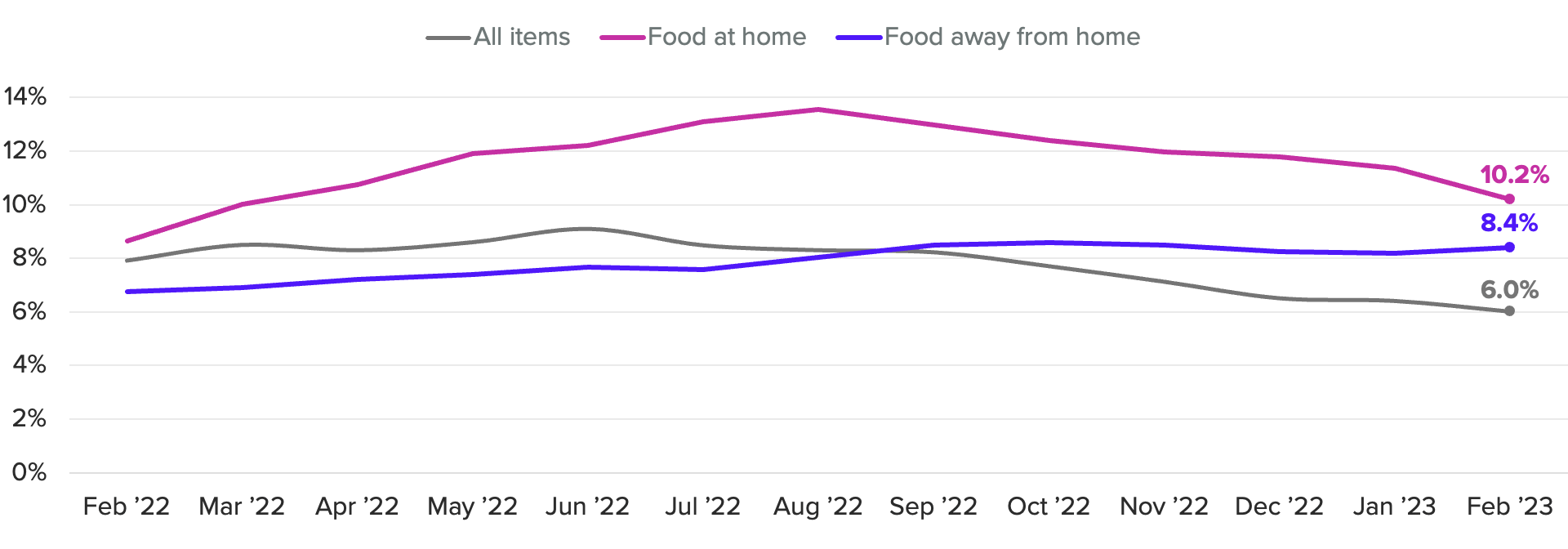 Lower-income consumers are less likely to buy restaurant meals in the first place and, as experienced budgeters, their price sensitivity is generally higher. But February data showed an inflection point where middle-income consumers reported a higher level of sticker shock than lower-income consumers when it came to restaurant prices. This suggests that those in the middle tier are increasingly feeling the impact of inflation on their monthly spending.