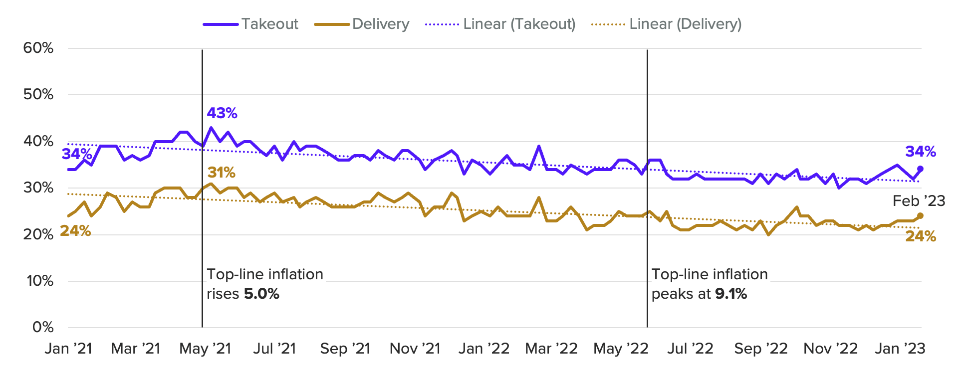 Since inflation started to climb in mid-2021, consumers have also reported less frequent off-premises orders. The share of U.S. adults ordering takeout at least once a week declined 9 points between May 2021 and February 2023.