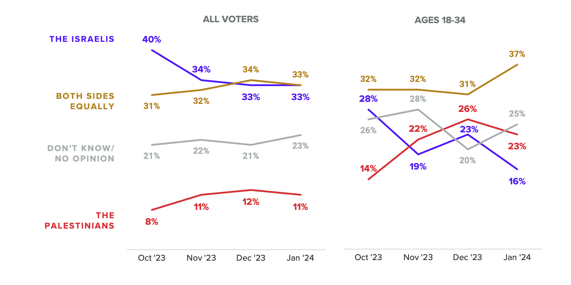 Our latest survey, which was conducted Jan. 17-19, found that a third of voters said they sympathize with the Israelis, matching the share who said both sides equally. Both shares have remained relatively flat since November 2023, as has the share expressing more sympathy for the Palestinians (11%).